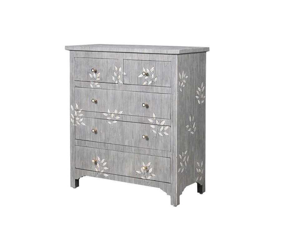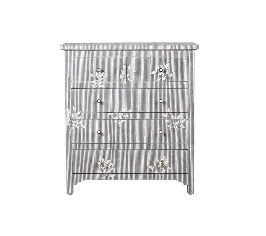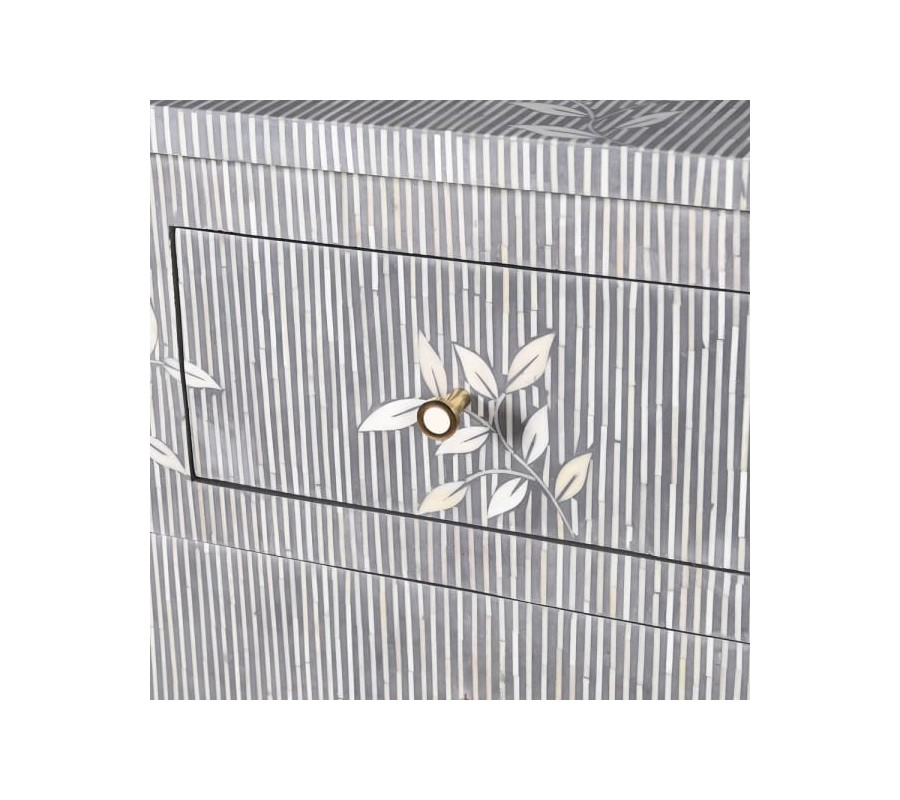 Komoda Liora je výnimočným kusom nábytku, v ktorom sa spája remeselná tradícia a umelecká precíznosť. Jej konštrukcia je vyrobená z mangového dreva, lakovaného do elegantného sivého odtieňa, do ktorého sú ručne vsadené drobné kúsky kosti tvoriace dekoratívnu kostennú intarziu. Touto technikou vzniká jemný rastlinný motív z listov a prúžkov, ktorý sa pravidelne opakuje na čelných aj bočných stranách a vytvára sofistikovaný kontrast so sivým podkladom zdobeným vertikálnymi líniami.