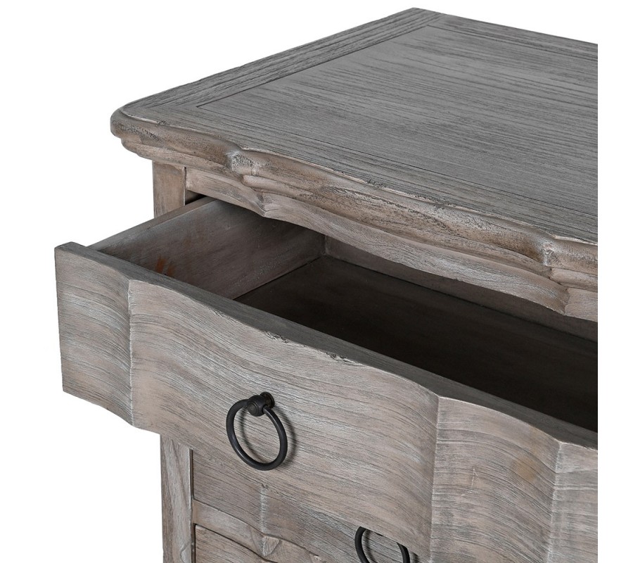 Klasická vintage komoda Château Gris predstavuje elegantný kus nábytku s výrazným remeselným spracovaním a nadčasovým charakterom. Konštrukcia je vyhotovená z masívneho Mindi dreva, pričom predná časť je jemne vyrezávaná v strede aj na krajoch, čo dodáva komode noblesný, dekoratívny vzhľad bez zbytočnej okázalosti.