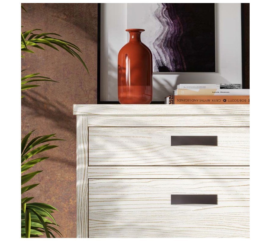 Každá zásuvka je vybavená kovovou úchytkou v jednoduchom obdĺžnikovom tvare, ktorá zvýrazňuje čistý dizajn a zabezpečuje komfortné používanie. Charakter nábytku podčiarkujú vyrezávané nožičky so skosením z vnútornej strany, vďaka čomu pôsobí komoda stabilne a zároveň vizuálne odľahčene.