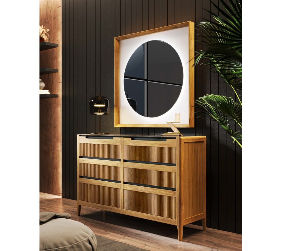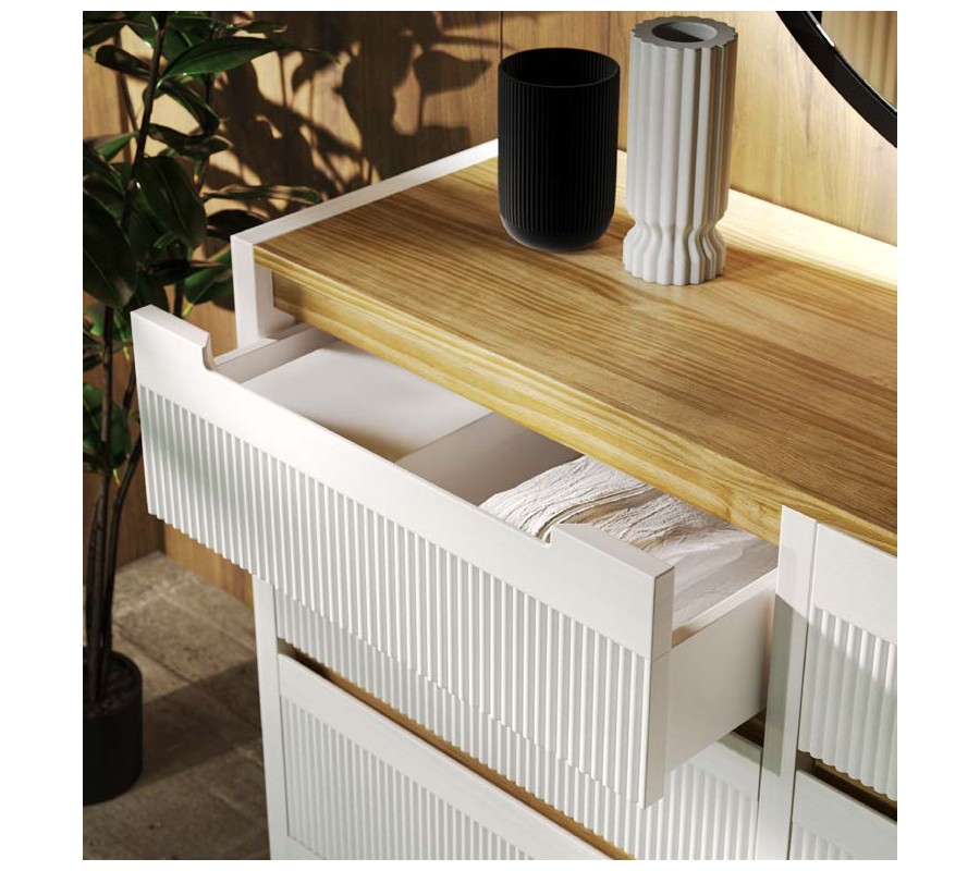 Komoda je riešená šiestimi zásuvkami usporiadanými po dvoch v troch radoch, pričom spodný rad tvorí dvojica rozmerovo väčších zásuviek s veľkorysým úložným priestorom. Predné plochy všetkých zásuviek zdobí charakteristické vertikálne vrúbkovanie, ktoré vytvára jemnú rytmiku, hru svetla a tieňa a dodáva nábytku bohatú textúru. Ovládanie zásuviek je riešené vyrezanými úchytkami iba na dvoch horných zásuvkách, ktoré sú integrované priamo do čelnej plochy, čím zostáva celkový dizajn čistý a vizuálne nerušený.