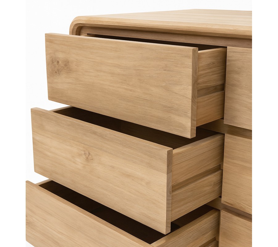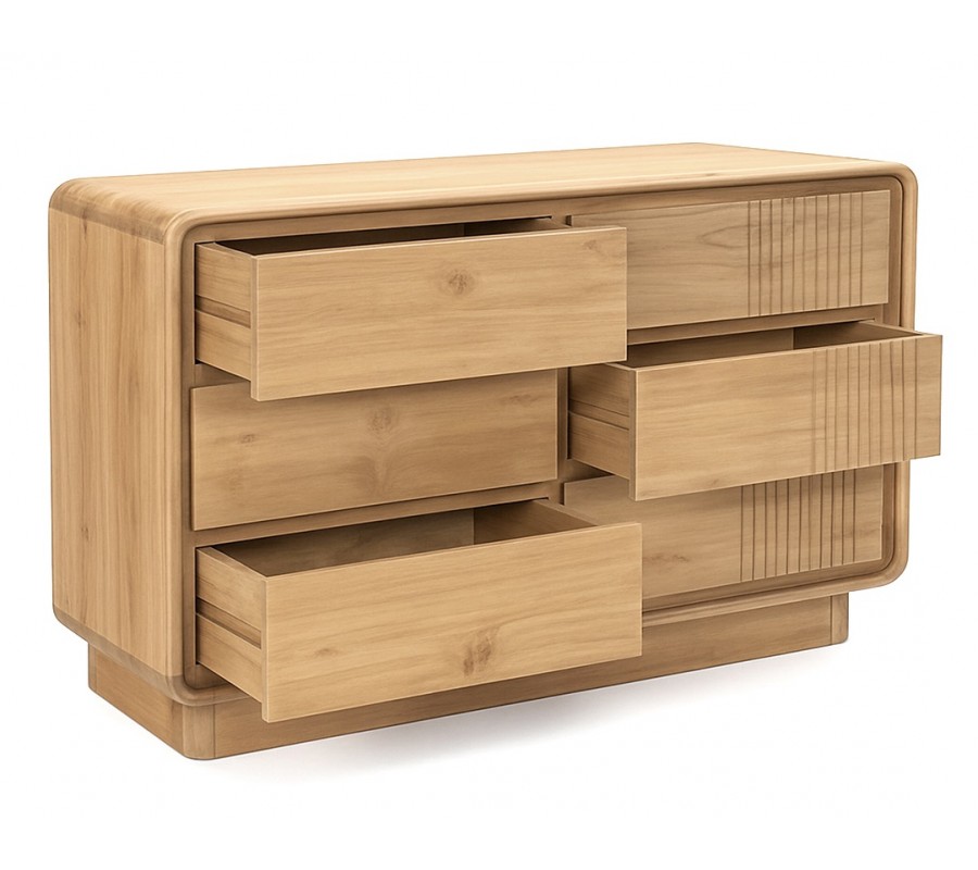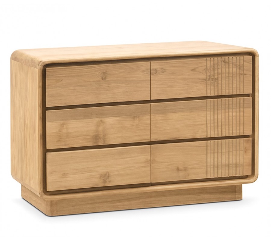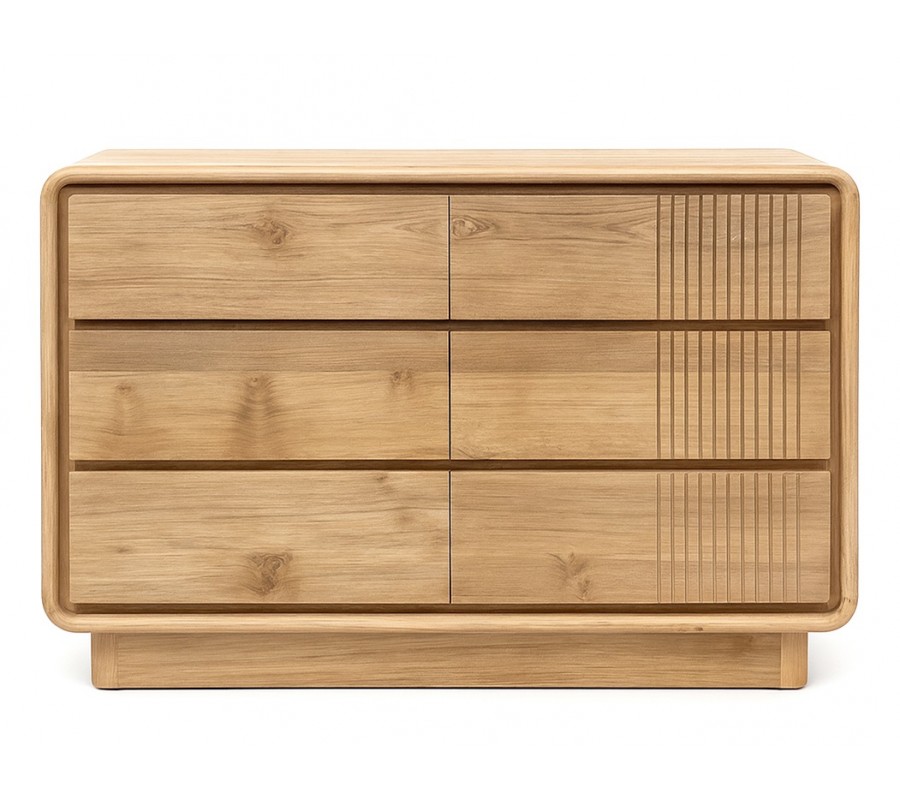 Úložný priestor pozostáva zo šiestich zásuviek, organizovaných po dvojiciach v troch radoch. Hladké čelá bez úchytiek pôsobia moderným dojmom, ktorý ešte dotvára vyrezávaný lineárny vertikálny reliéf na ľavej strane. Do geometrického dizajnu prináša jemnú asymetriu. Rohy úložného priestoru sú výrazne zaoblené, inšpirované tzv. waterfall nábytkom v retro štýle, ktorý bol mimoriadne populárny v 20. rokoch minulého storočia. V spodnej časti sa nachádza nižšia plná podstava. Má tiež zaoblené rohy a menší rozmer ako úložný priestor, čo komodu vizuálne odľahčuje.