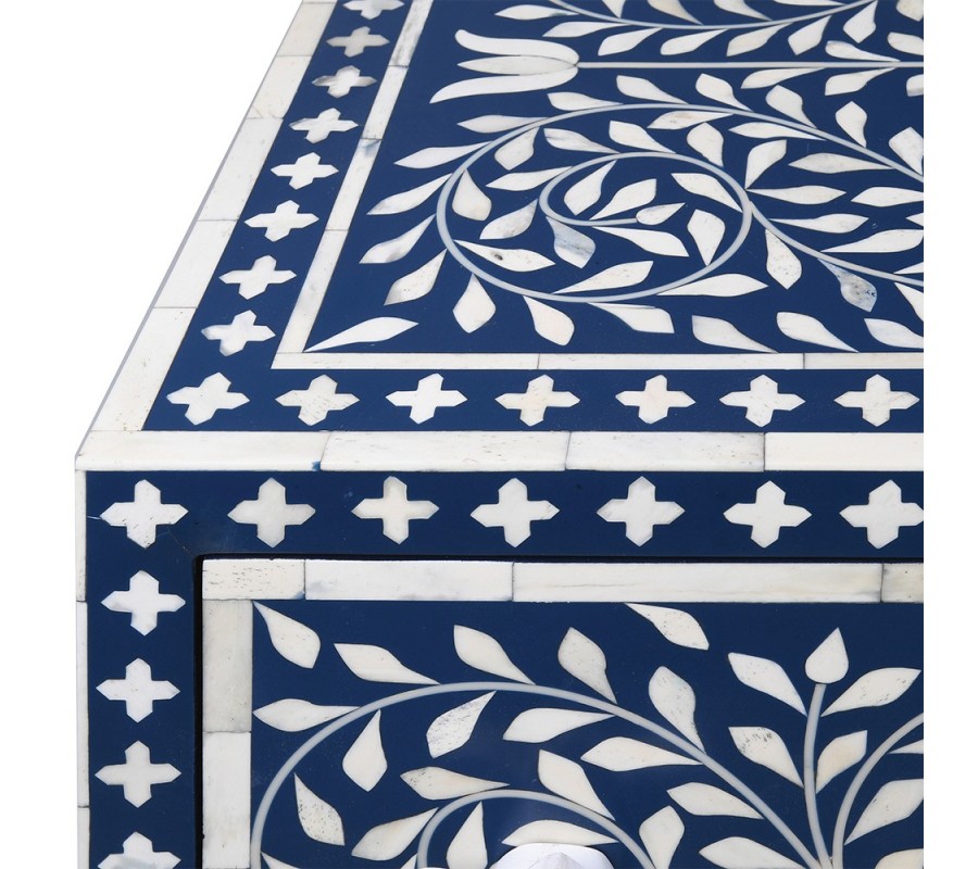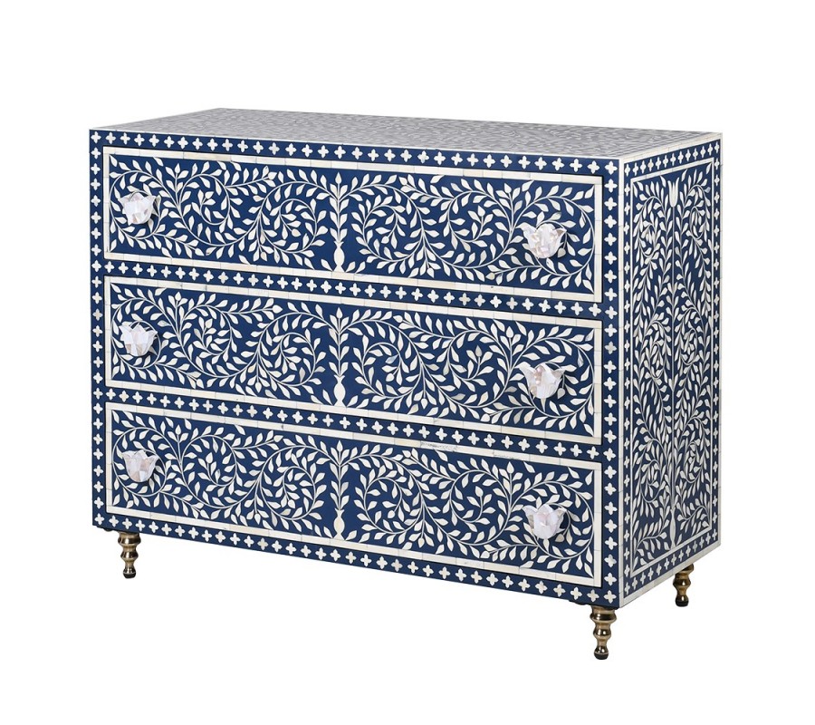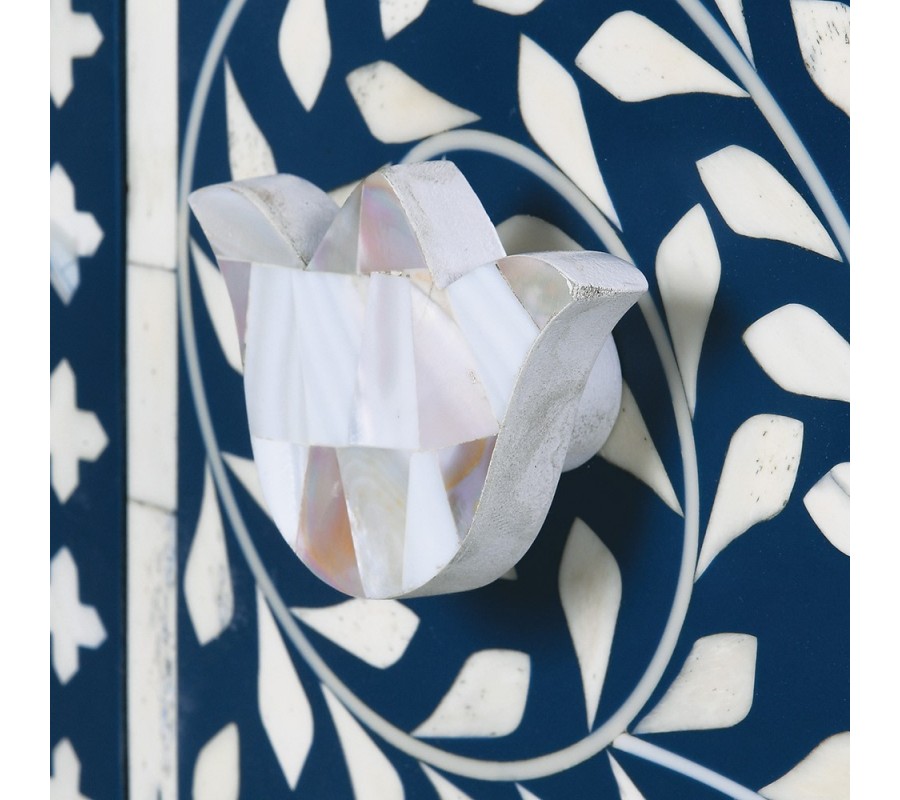 Luxusná etno komoda Daytona pôsobí ako výrazný dizajnový solitér, ktorý do interiéru vnáša noblesu, remeselnú hodnotu a jemný orientálny nádych. Obdĺžnikový korpus z masívneho mangového dreva je po celom povrchu zdobený precíznou intarziou z byvolej kosti, vytvorenou tradičnou technikou bone inlay. Bohatý florálny motív v modro-bielej farebnej kombinácii pôsobí elegantne a vzdušne, pričom jemné kontrasty a detailné spracovanie dodávajú komode luxusný a zároveň nadčasový charakter.