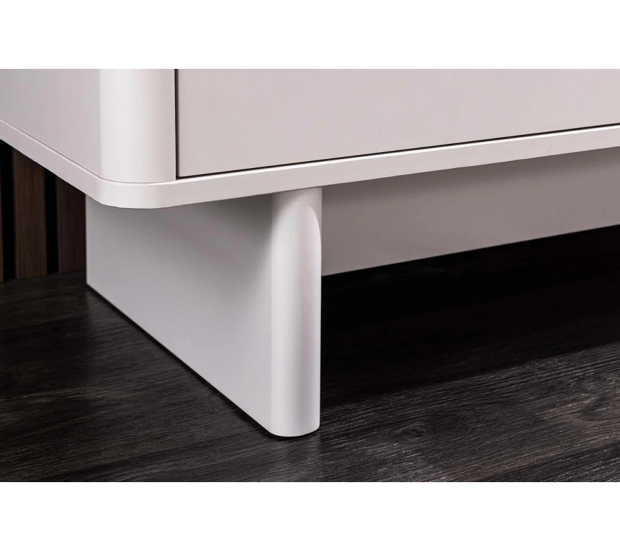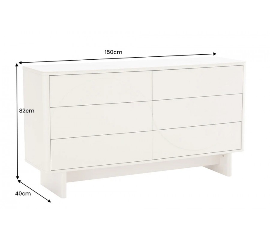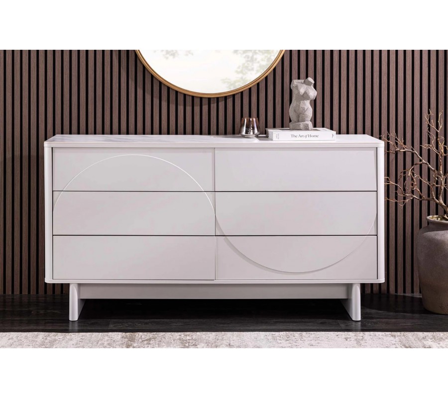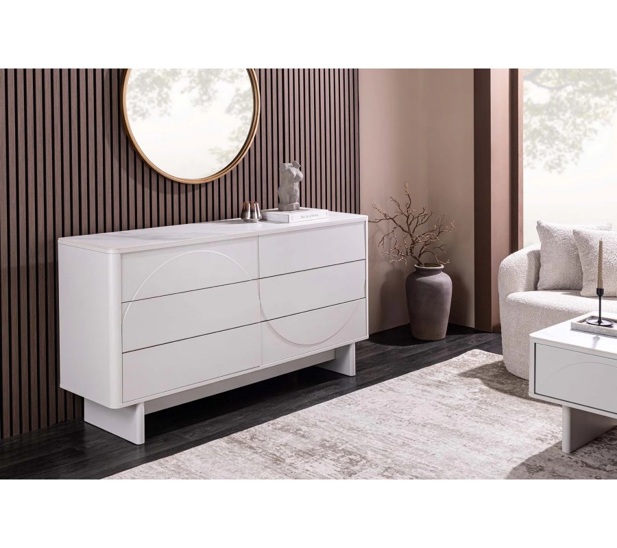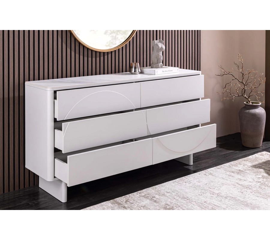 Komoda je vyrobená z kvalitnej dyhy s lakovaním v čistej bielej farbe. Krásne ju dopĺňa keramická vrchná doska s dizajnom bieleho mramoru s jemnými sivými žilkami. Pôsobí luxusne a zároveň zabezpečí pevný a odolný povrch. Úložný priestor je organizovaný do šiestich zásuviek, umiestnených po dvojiciach v troch radoch. Dve nohy majú široký obdĺžnikový tvar sú vyššie, čo odľahčuje a vyvažuje mohutný úložný priestor. Pre lepšiu stabilitu ich prepája lineárna výstuha.