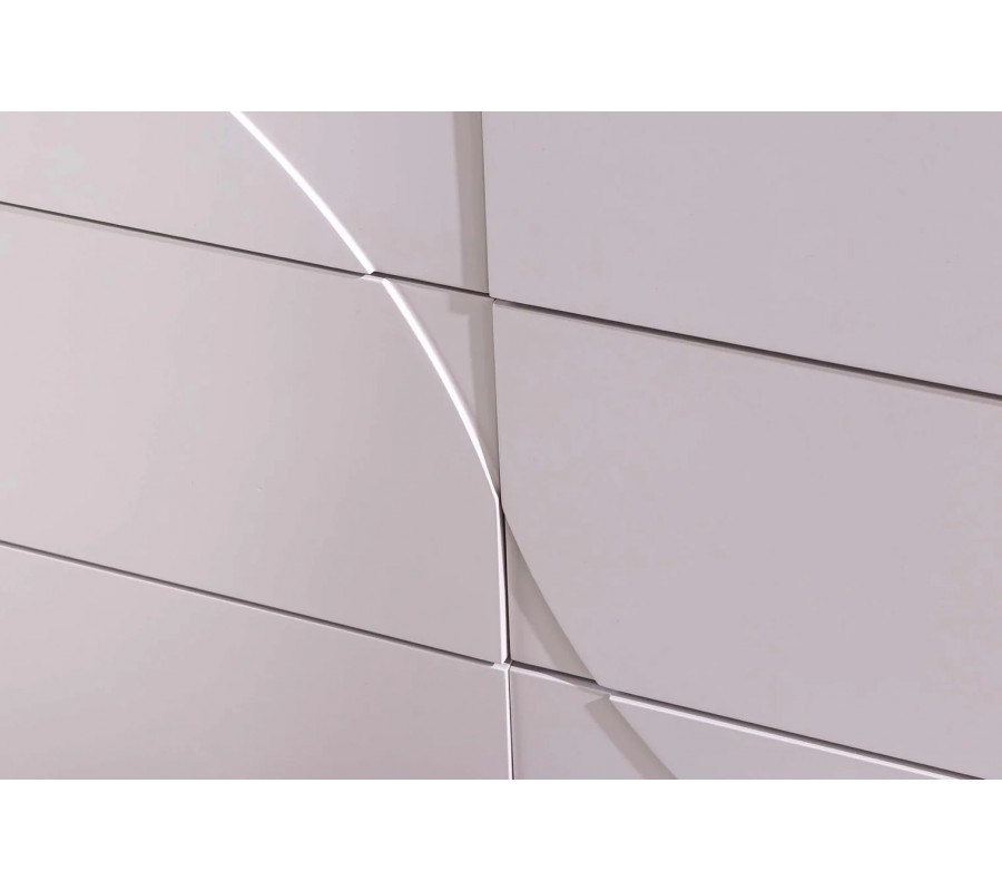 Komoda má lineárnu siluetu, s modernými hladké povrchmi. Je zjemnená elegantnými zaoblenými rohmi a hranami, ktoré sa výborne prepájajú s reliéfnym zdobením na fasáde v podobe geometrickej vlny, zloženej z dvoch poloblúkov. Dizajn je minimalistický, vytvorený pomocou vyvýšených a znížených plôch, no jeho tvar je zároveň dynamický a dodáva nábytku nádych art deco štýlu.