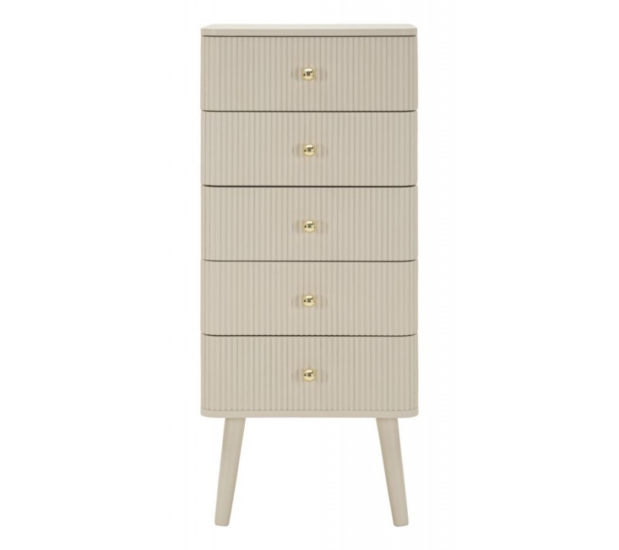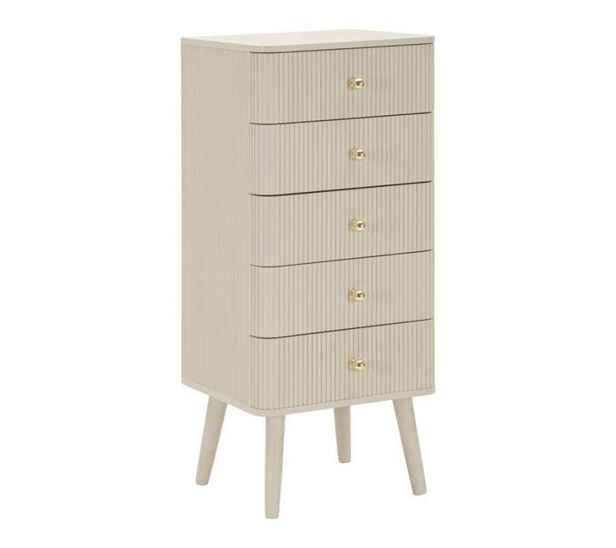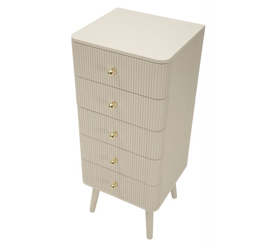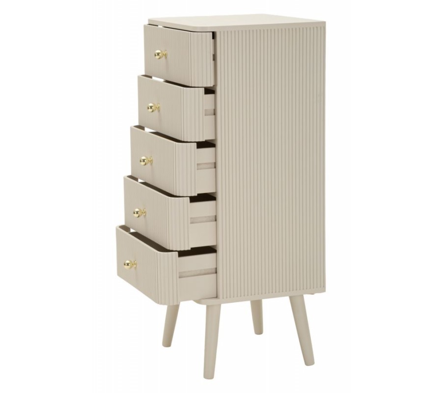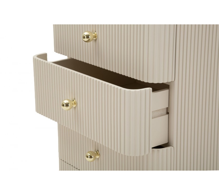 Art deco vysoká béžová komoda Shelly s piatimi zásuvkami so zlatými úchytkami a rebrovaným reliéfnym zdobením 89 cm
