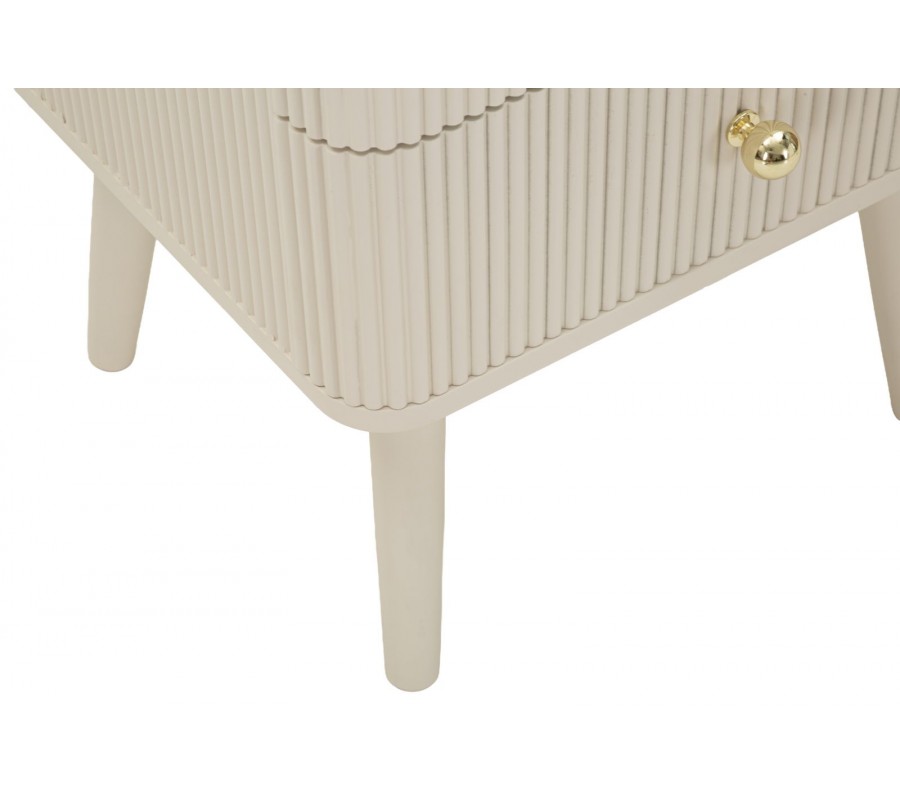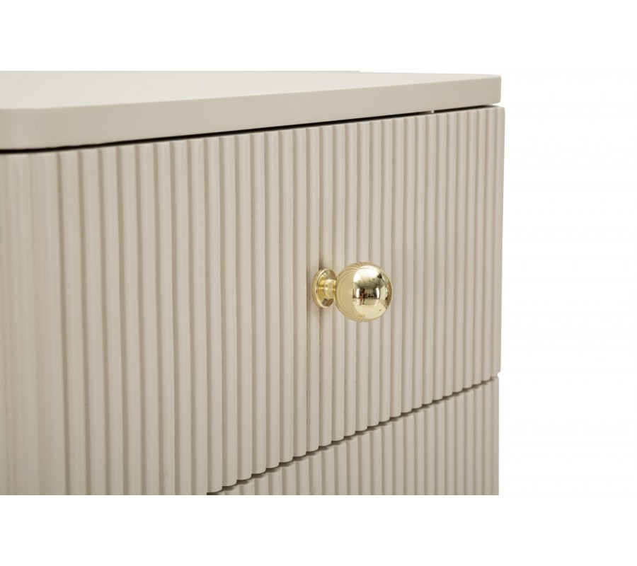 Prednú a bočné strany zdobí vertikálny rebrovaný reliéf, ktorý dodáva komode exkluzívny art deco výraz. Túto estetiku dopĺňajú aj guľaté úchytky v lesklom zlatom kovovom prevedení. Predné hrany sú zaoblené, čo zjemňuje celkový tvar a dodáva mu eleganciu.
