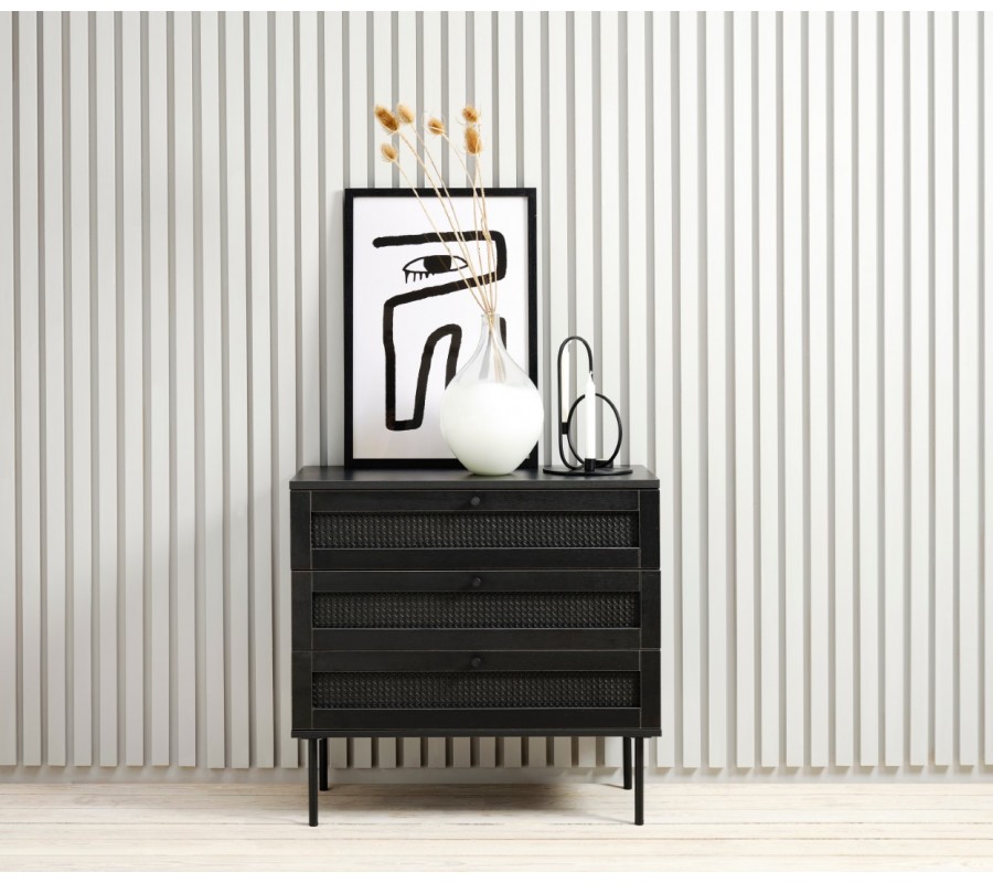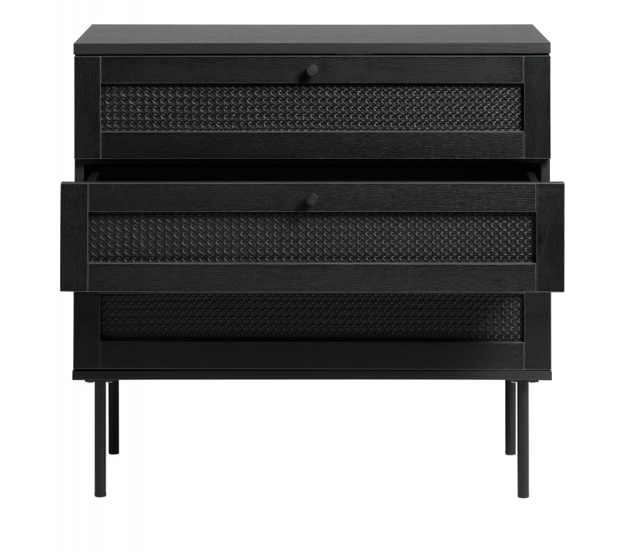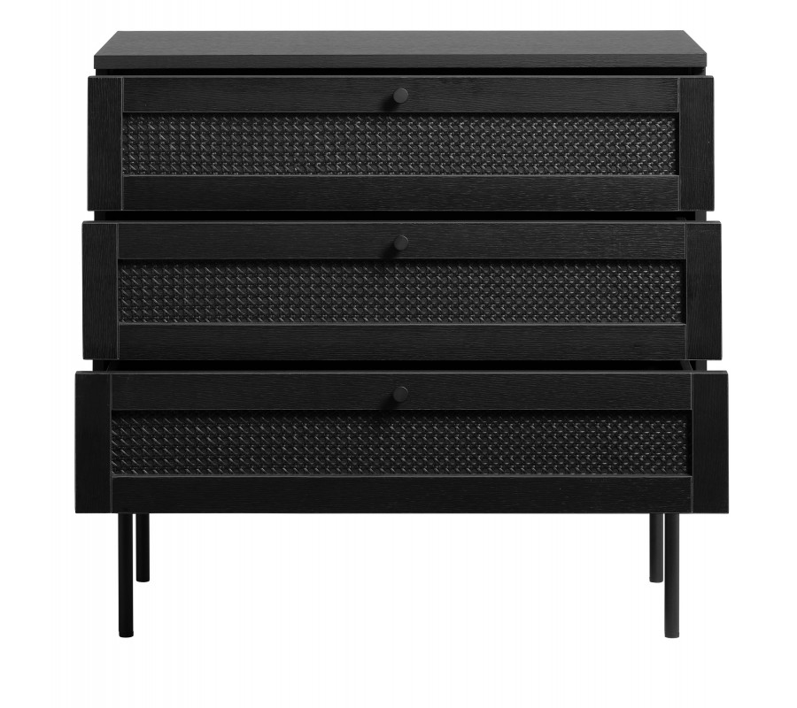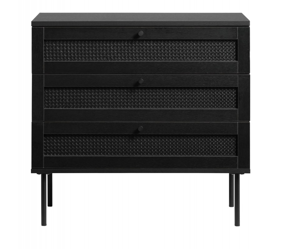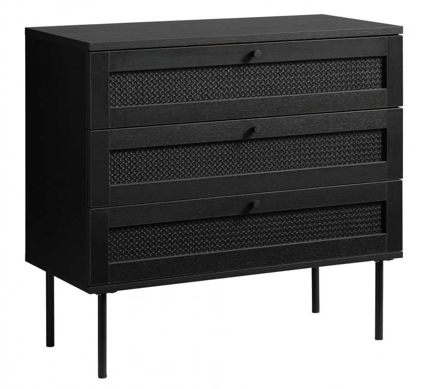 Industriálna komoda Malmo s tromi zásuvkami s ratanovým výpletom na kovových nožičkách v čiernej farbe 80 cm