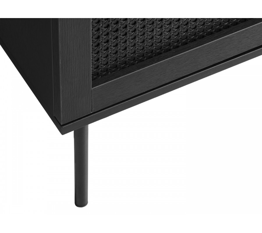 Komoda je vyrobená z kvalitnej MDF dyhy s melamínovou povrchovou úpravou, zabezpečujúcou výbornú odolnosť voči vplyvom každodenného používania. Čierne lakovanie pôsobí sofistikovane, zatiaľ čo dubový vizuál s pravidelnou kresbou letokruhov v kombinácii s ratanom dodáva nábytku teplý prírodný výraz. Kovová podstava a úchytky sú takisto vyhotovené v čiernej farbe a prináša do dizajnu nádych industriálneho štýlu.