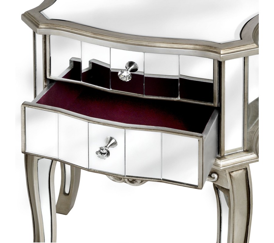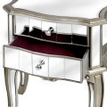 Elegantný a ozdobný zrkadlový nočný stolík v striebornej farbe s červeným vnútrom zásuviek bude neprehliadnuteľným prvkom vášho interiéru.