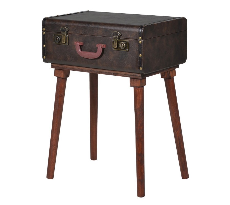 Jedinečný príručný stolík Maleta v tvare starožitného kufra je dokonalým doplnením koloniálnych interiérov vášnivých cestovateľov či priestorov s cestovateľskou tematikou. Povrch kufra s koženým efektom slúži ako odkladacia doska stolíka a zároveň poskytuje uzatvárateľný úložný priestor vo vnútornej časti. Vnútorný odkladací priestor je ideálnym miestom na ukrytie vašich dobrodružných zážitkov v podobe suvenírov, máp a fotografii z obľúbených geografických či životných ciest. Kufor je umiestnený na drevených nohách v tmavých odtieňoch. Praktický príručný stolík je doplnený ozdobným úchytom v podobe kontrastnej červenej farby. Kožený povrch je ozvláštnený kovovými čalúnickými sponkami a prvkami typickými pre uzatvárateľný mechanizmus kufrov. Príručný stolík Maleta je dokonalým doplnením atmosféry tématických klubov, kaviarní či barov v koloniálnom štýle.