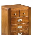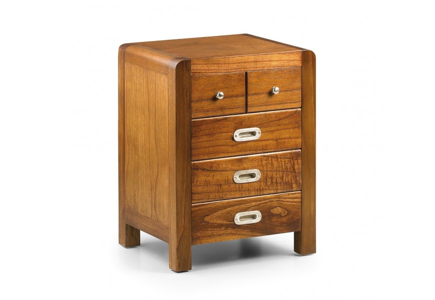 Štýlový elegantný nočný stolík z kolekcie FLASH je vyrobený z masívneho koloniálneho dreva MINDI s povrchovou úpravou farby tmavého dubu. Je špecifický oblými hranami, ktoré môžu byž výhodou pre domácnosti s deťmi prípadne kde je nutné dbať na zvýšenú bezpečnosť. Z hľadiska kvality je to špička medzi koloniálnym nábytkom, ktorý sa hodí do každého priestoru. Poskytuje úložný priestor v podobe piatich praktických zásuviek, ktoré možno využiť na uschovanie drobnejších predmetov. Na zásuvkách sa nachádzajú strieborné rukoväte, ktoré tvoria prírodnému materiálu zaujímavý kontrast. Nočný stolík Flash skvelo zapadne do klasicky či koloniálne ladených spální. Odporúčame taktiež kombinovať s ďalšími kúskami z našej rovnomennej kolekcie.