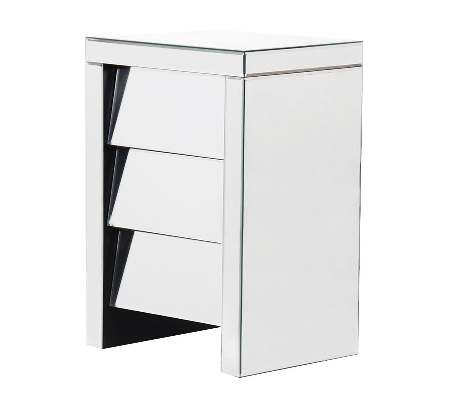 Štýlový moderný nočný stolík Granada je jedinečným moderným kúskom doplnený o zrkadlový efekt. Štýlový nočný stolík zaujme na prvý pohľad svojím štýlovým dizajnom a originálnymi troma šikmými zásuvkami, ktoré poskytujú množstvo úložného priestoru. Doplňte Štýlový moderný nočný stolík Granada o ďalšie kúsky z kolekcie nábytku Granada.