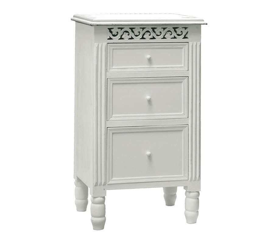 Luxusný nočný stolík z kolekcie Blanc Clair s troma zásuvkami v romantickom provensálskom štýle príjemne obohatí Vašu domácnosať najmä vďaka svojim čistým a jemným líniám v bielej farbe. Veľmi nežne pôsobí i pričinením zdobených nôžok a vyrezávaných vzorov.