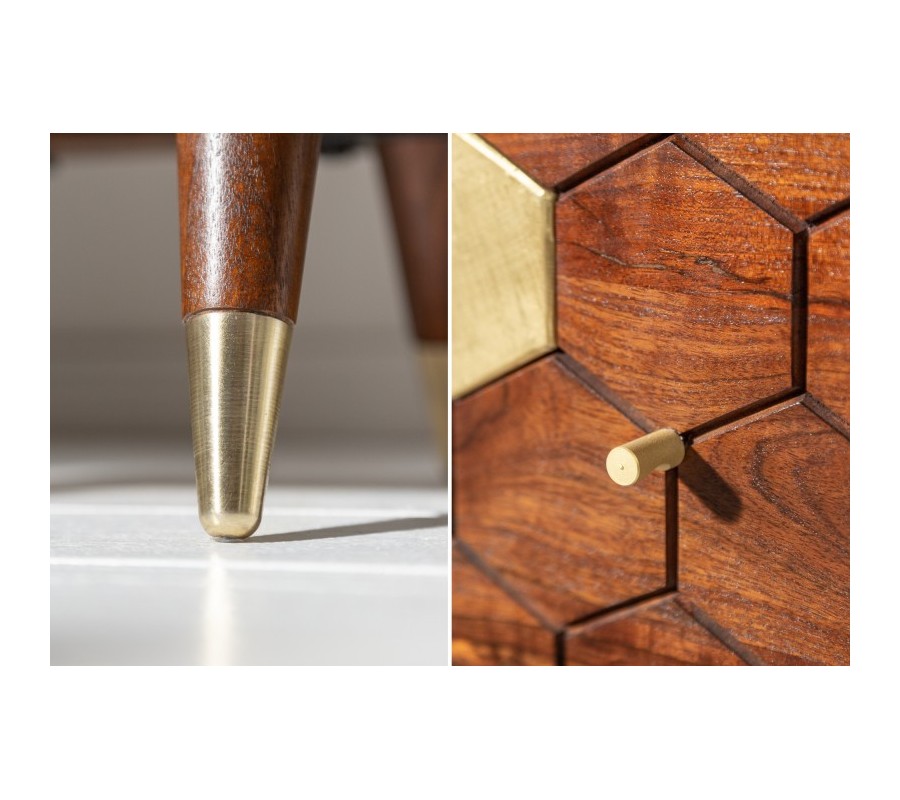 Štýlový príručný stolík Roslin zaujme predovšetkým milovníkov kvality a originálneho dizajnu. Je vyrobený z masívneho akáciového dreva a na jeho povrchu vidno zaujímavú kresbu, ktorá mu dodáva príjemný naturálny nádych. Disponuje dvomi praktickými zásuvkami vhodnými na úschovu drobnejších predmetov. Rozširujúce sa okrúhle nožičky sú obohatené o zlatý prvok, ktorý vytvára zaujímavý art-deco nádych a zároveň ladí s rukoväťami a organickým dizajnom na zásuvkách, ktorý pripomína medové plásty. Príručný stolík Roslin vynikne v svetlejších obývačkách, ale možno ho tiež využiť v spálňach ako stolík nočný. Vhodná je kombinácia s masívnym nábytkom a dekoráciami v art-deco štýle, ideálne s prírodnými farbami ako je zelená, žltá či béžová. Odporúčame taktiež kombinovať s ďalšími kúskami z našej kolekcie Roslin.
