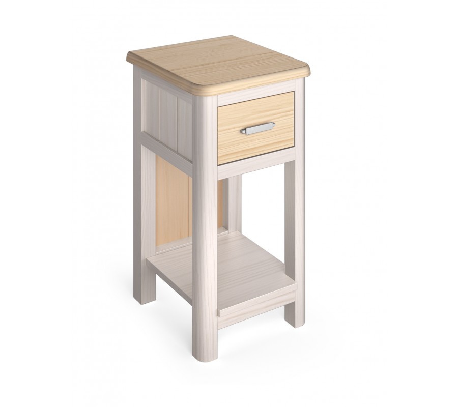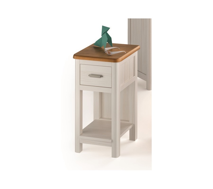 Stolík má štvorcovú vrchnú dosku, ktorá mierne prečnieva cez zásuvku umiestnenú pod ňou, čo vytvára minimalistický dekoratívny efekt. Zásuvku dopĺňa jednoduchá horizontálna kovová úchytka. Predné zvislé hrany stolíka, prechádzajúce cez líniu nožičiek sú výrazne zaoblené, čo zjemňuje moderný dizajn, zatiaľ čo zadné sú rovné a umožňujú nábytok stabilne prisunúť k stene. V spodnej časti je umiestnená polica s plnou zadnou stranou, vhodná aj na odkladanie väčších predmetov.