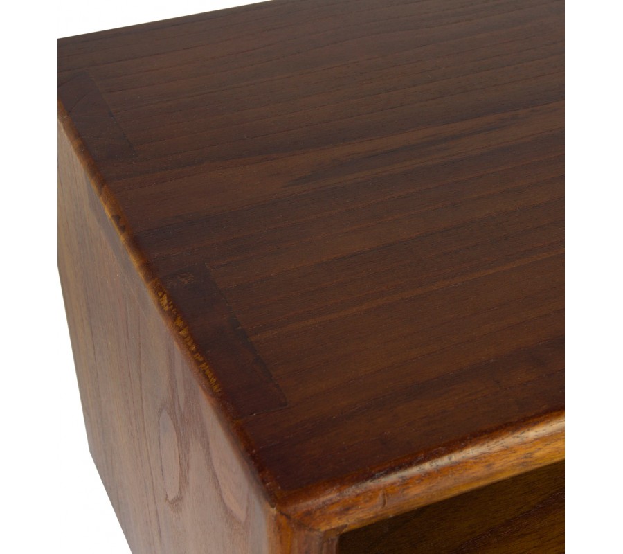Stolík je vyrobený z exotického dreva mindi, ktoré je vďaka svojej odolnosti a unikátnemu vzhľadu obľúbeným materiálom v nábytkárstve. Na povrchoch stolíka je viditeľná výrazná kresba letokruhov. Drevo mindi má prirodzený lesk a teplú hnedú farbu s podtónmi žltej a červenej, čo mu dodáva exkluzívny vzhľad. Biela farba zásuvky vytvára kontrastný akcentový prvok a podčiarkuje výnimočný charakter prírodného materiálu.