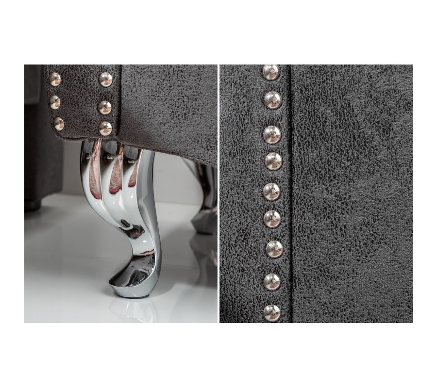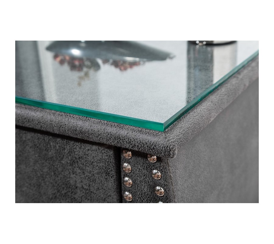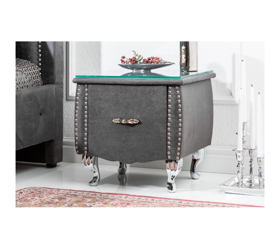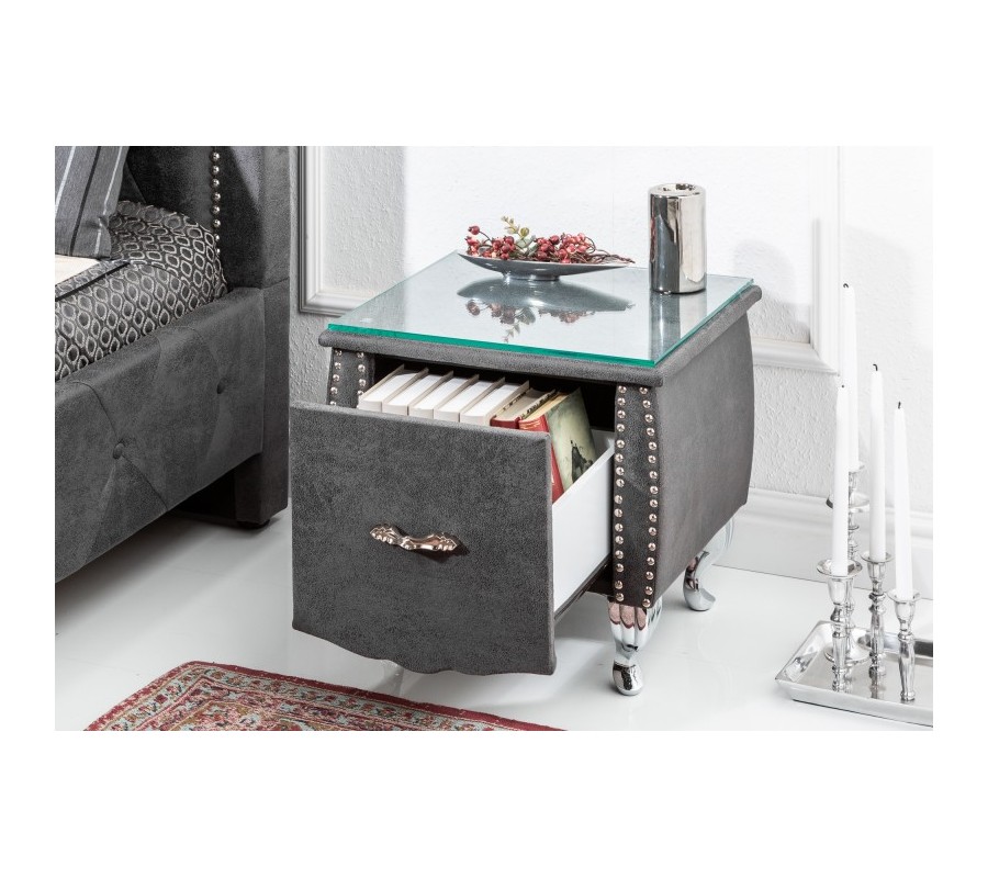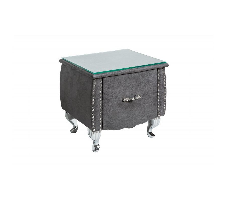 Ak hľadáte štýlový doplnok do vašej modernej spálne, nočný stolík Yvonne môže byť tým pravým kúskom pre vás! Univerzálna sivá farba poľahky zapadne do každého priestoru, či už ladeného v svetlejších alebo tmavších farbách. Stolík Yvonne disponuje praktickou zásuvkou so štýlovou kovovou rukoväťou, ktorá krásne ladí ku kovovým tvarovaným nohám. Dizajn je doplnený o štýlové aplikácie v podobe kovových cvokov na okrajoch stolíka. Poťah z mikrovlákna a vzhľadom pripomína kožu. Povrchová doska je zo skla. Stolík možno využiť ako nočný, alebo aj príručný stolík vo vašej obývačke. Vďaka svojmu vzdušnému dizajnu zaručene vaše priestory rozžiari.