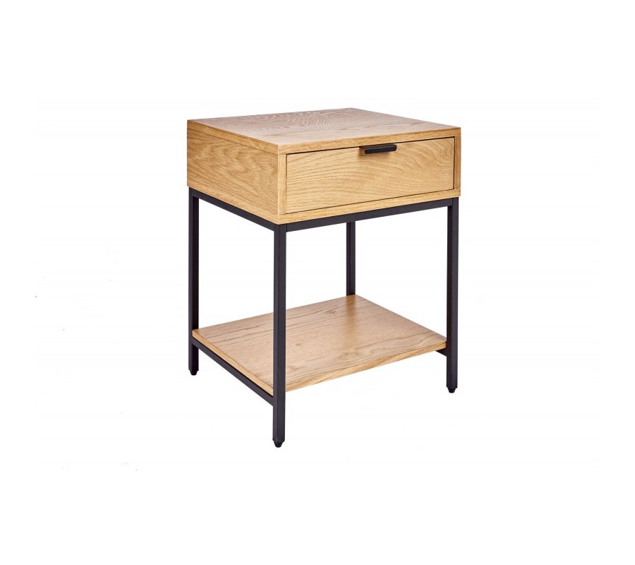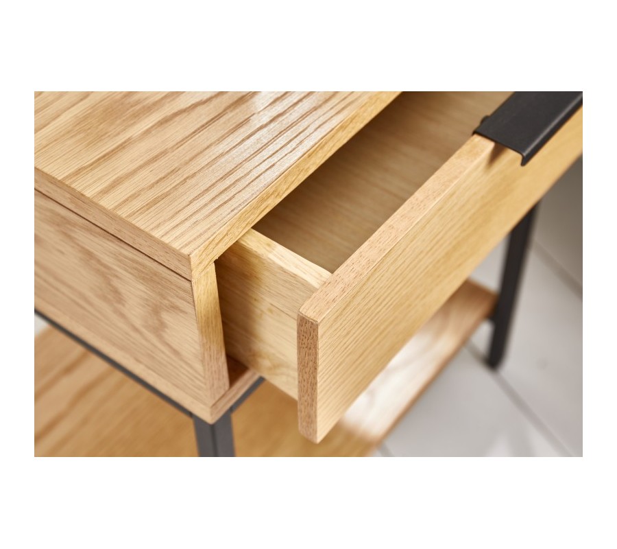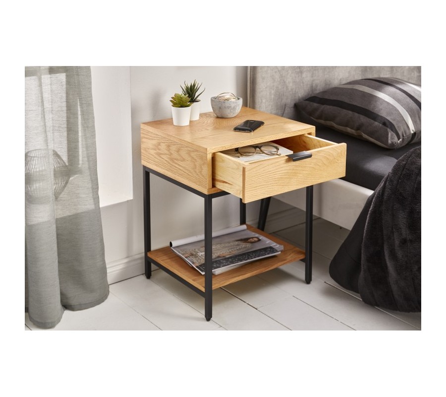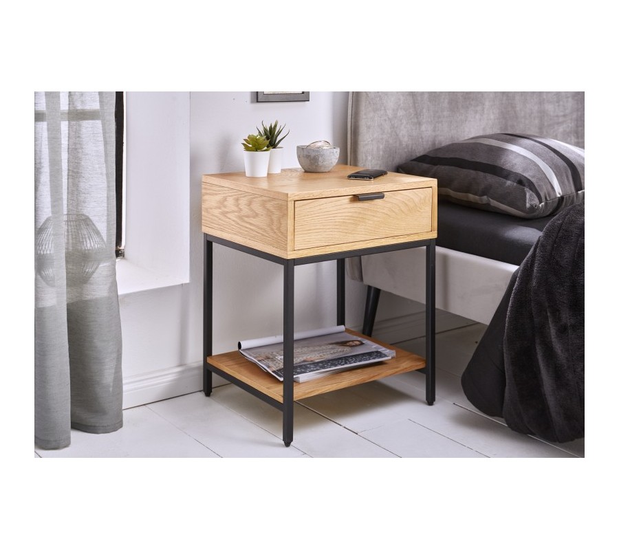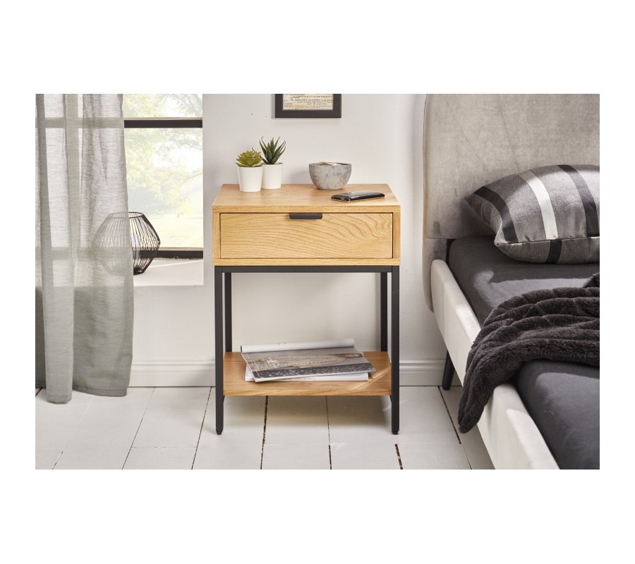 Štýlový nočný stolík Tacoma je zaujímavým kúskom vhodným najmä do industriálne ladených spální. Je vyrobený z kombinácie MDF a drevenej dyhy v prírodnej hnedej farbe, na ktorej možno vidieť zaujímavú kresbu dreva. Konštrukcia z kovu sa nesie v čiernej farbe, rovnako ako rukoväť na praktickej zásuvke. Celý dizajn je tak príjemne zladený v hnedej a čiernej farbe, ktoré skvelo zapadnú do svetlých i tmavších interiérov. Nočný stolík Tacoma sa dá kombinovať so širokou škálou farieb, ideálne v naturálnych odtieňoch.