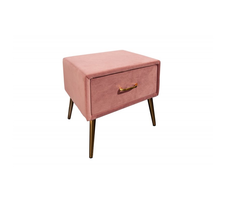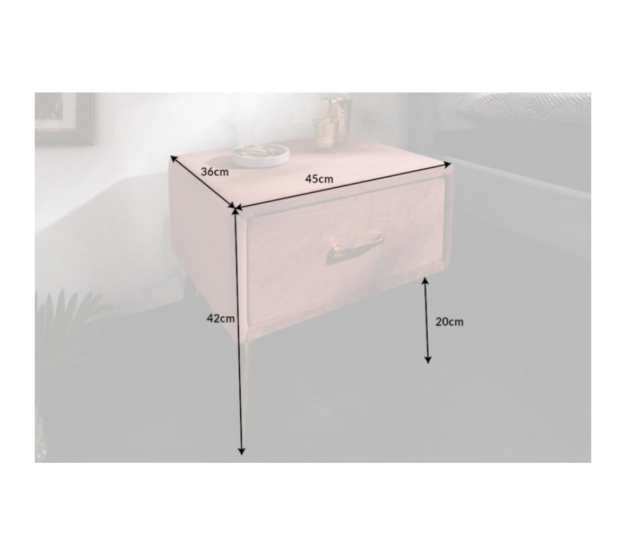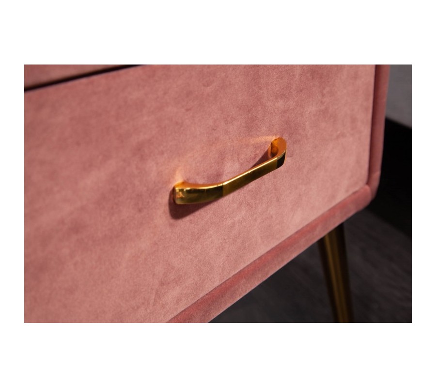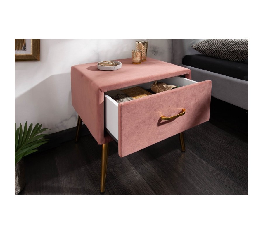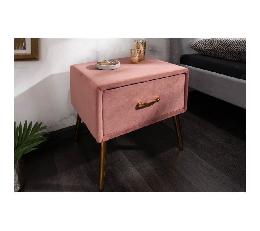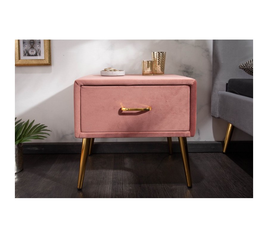 Jedinečný nočný stolík Ribble je kúskom, ktorý vás zaručene zaujme už na prvý pohľad. Predovšetkým je špecifický svojím zamatovým poťahom v staroružovej farbe, ktorý spríjemní vaše spálňové priestory a vnesie do nich jedinečný nádych domova. Ružový zamat je doplnený elegantnými zlatými prvkami z kovu, ktoré vytvárajú štýlový art-deco efekt. Stolík disponuje praktickou zásuvkou vhodnou na odkladanie drobnejších predmetov, ktoré chcete mať po ruke aj v noci. Krásne vynikne predovšetkým v tmavších priestoroch, ktoré rozžiari, a dá sa výborne doladiť rôznymi art-deco dekoráciami z kovu či skla.