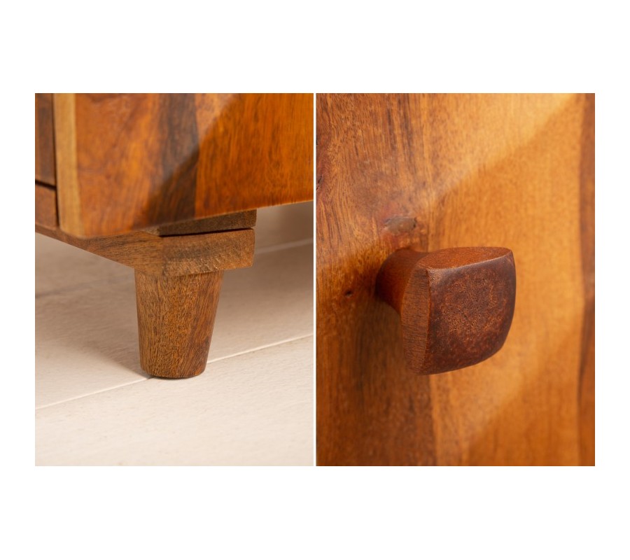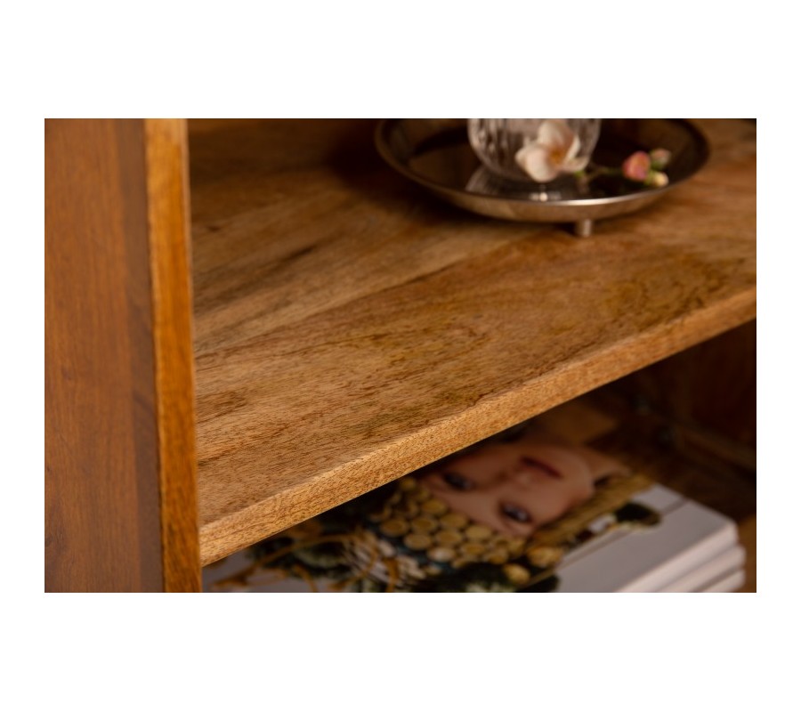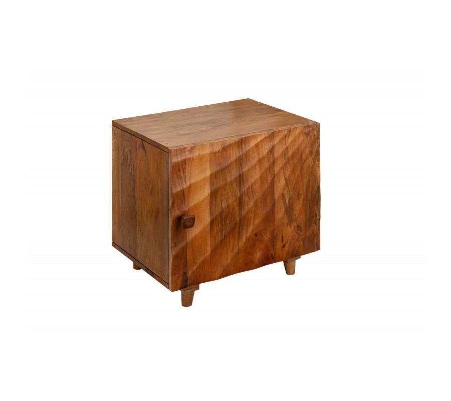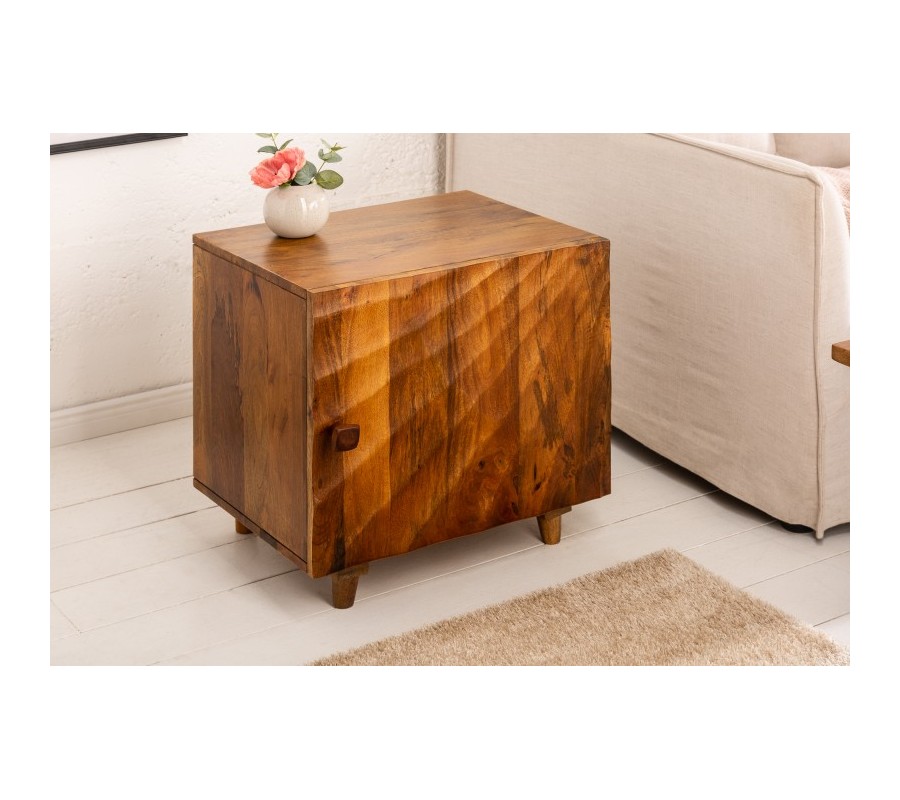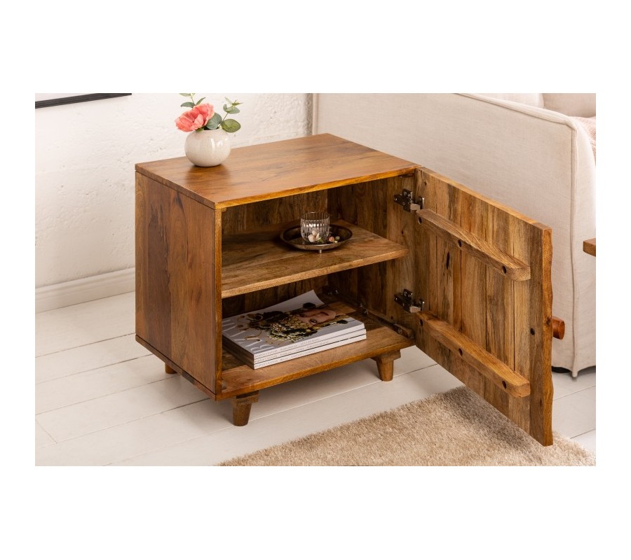 Štýlový príručný stolík Cumbria je dizajnovým doplnkom každej modernej obývačky. Je vyrobený z masívneho mangového dreva, pričom povrchová úprava necháva vyniknúť prirodzenú kresbu dreva. Stolík disponuje dvomi poličkami s dvierkami, ktoré zdobí zaujímavý reliéf. Krásny prírodný drevený dizajn vynikne v moderných i alternatívne ladených priestoroch. Stolík možno využiť v obývačke, ale aj ako nočný stolík vo vašej spálni. Vďaka naturálnej hnedej farbe poľahky zapadne do svetlejšie i tmavšie ladených interiérov.