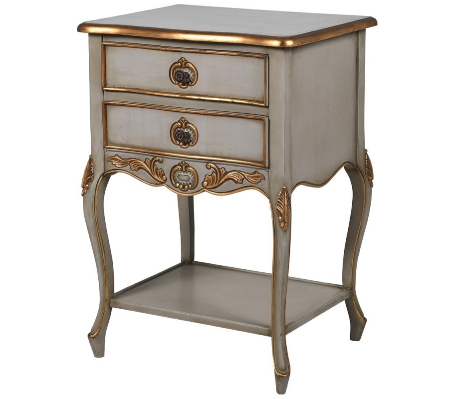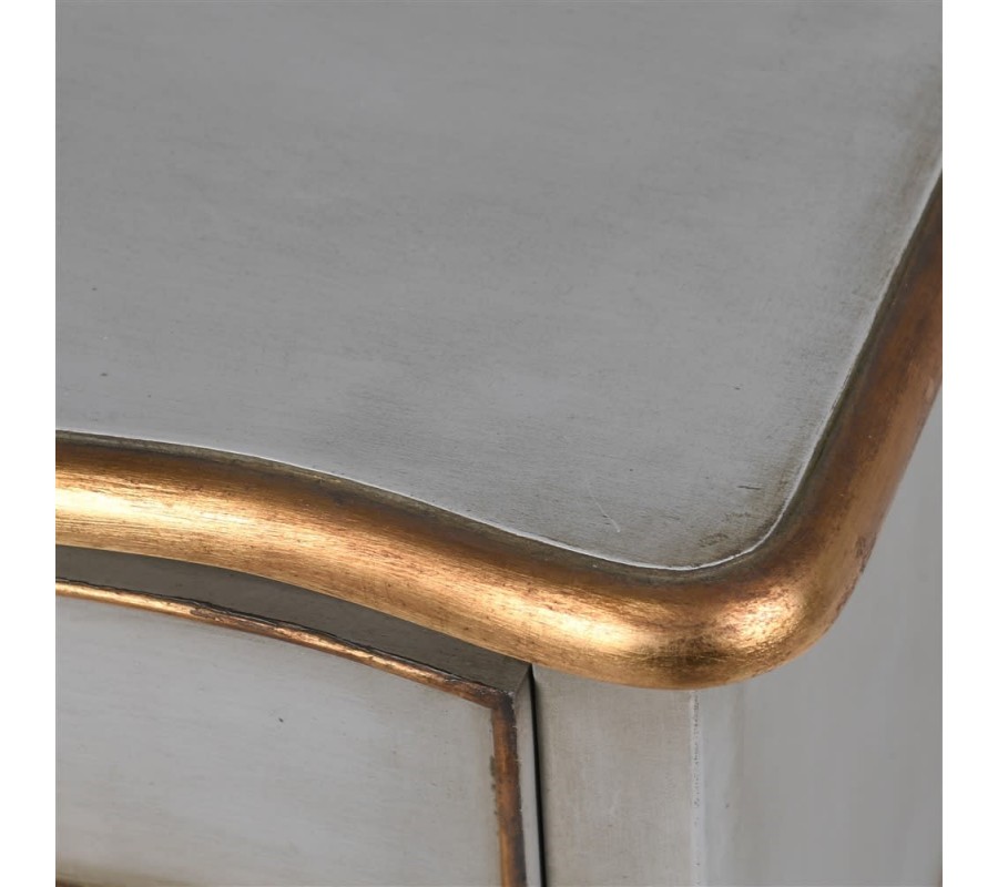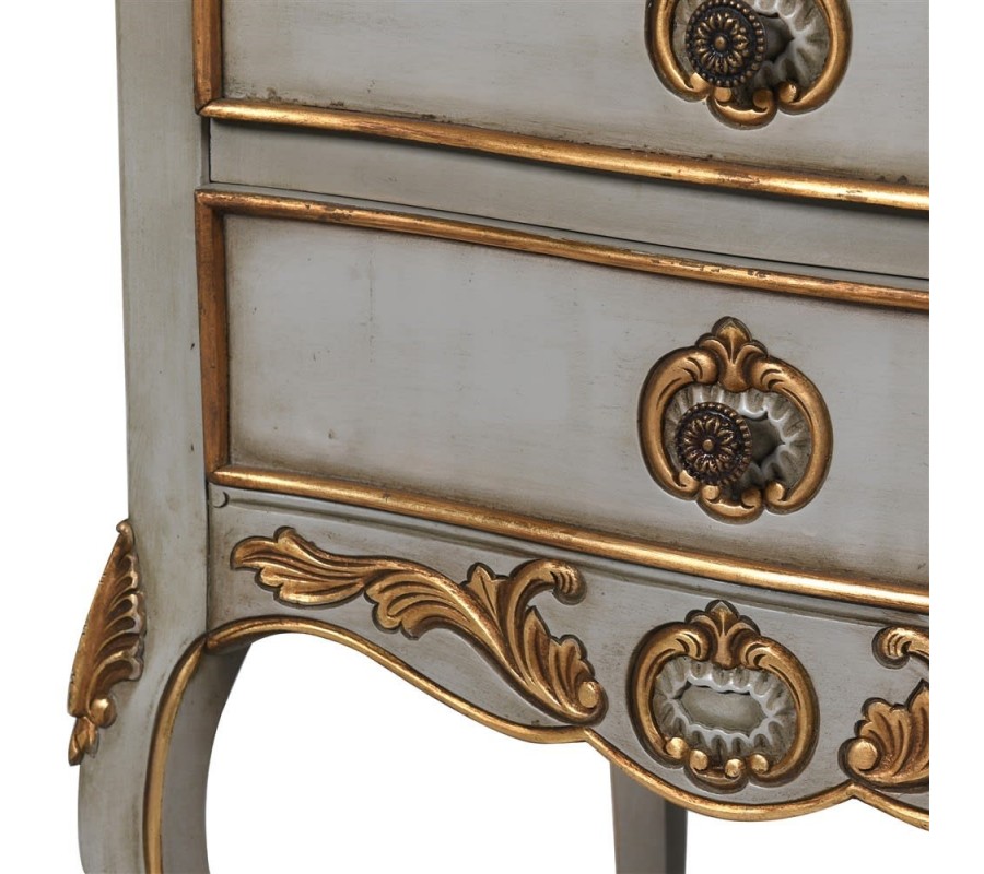 Nočný stolík z kolekcie Crema je predstaviteľom historického francúzskeho štýlu, s pompéznym tvarom, tvarovanými líniami a s ozdobnými detailmi. Stolík v bielej farbe je vyrobený z masívneho mahagónu, skladá sa z dosky, poličky, z dvoch zásuviek a zo štyroch stabilných nôh. Vďaka dvom zásuvkám a poličke, ktorá je umiestnená v spodnej časti, stolík disponuje s praktickými úložnými priestormi. Jeho ozdobné prvky v zlatej farbe a tvarované nohy v typickom barokovom štýle upútajú každého pozornosť. Ozdobné prvky sa objavujú na okraji stolíka a zásuviek v podobe jednoduchých línií. Prvky sa taktiež objavujú na nohách a v okolí úchytiek v podobe dekoračných listov. Nočný stolík odporúčame umiestniť do priestranných spální, ktoré sú zariadené v barokovom, alebo rustikálnom štýle. Najznámejšia farebná kombinácia barokových izieb je biela, piesková a béžová v kombinácii so zlatou. Pre súčasné barokové interiéry v sú prijateľné aj odvážnejšie farby, ako vínová, tmavomodrá, tlmená zelená, hnedá a terakotová farba.