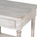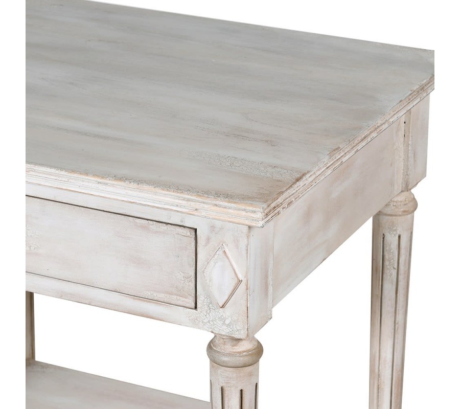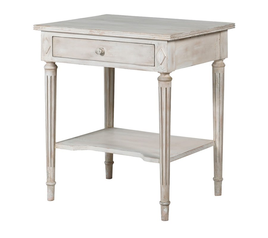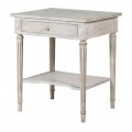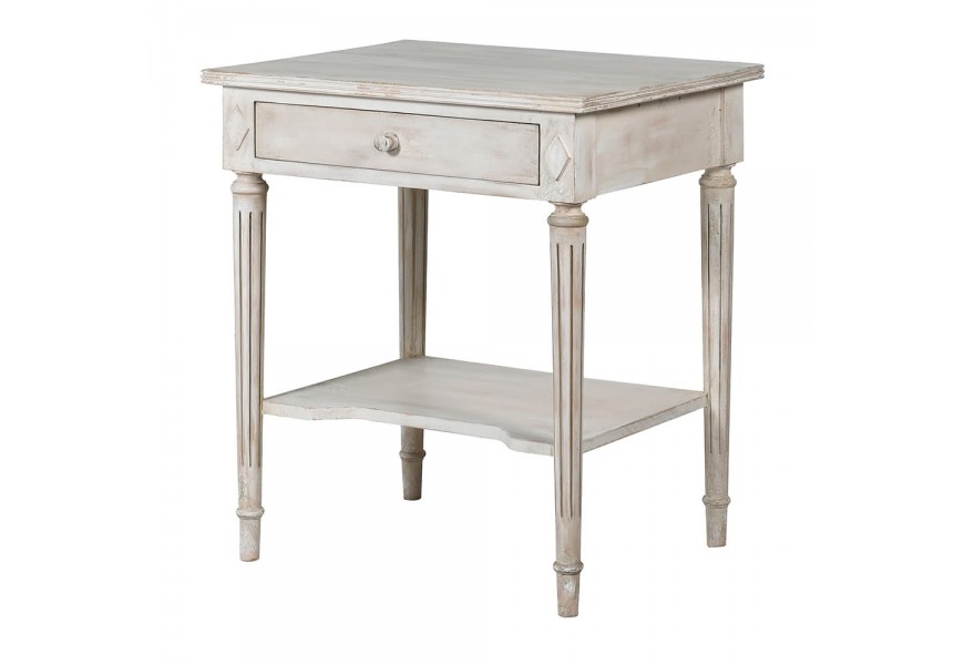 Štýlový príručný stolík zaujme každého svojim jemným vidieckym štýlom a opotrebovaným vzhľadom. Stolík je vyrobený z mahagónového dreva s bielou povrchovou úpravou. Na stolíku sa nachádzajú jemné dekoratívne prvky, ktoré mu dodávajú nádych vintage a provensálskeho štýlu. Štyri nohy stolíka sa postupne z hora nadol zužujú a pozdĺž sa na nich nachádzajú vertikálne vyrezávané jednoduché dekoratívne línie. Súčasťou stolíka je aj malý úložný priestor v podobe zásuvky a menšej poličky. Príručný stolík je možné použiť aj ako nočný stolík, umiestnený do spálne vedľa postele. Príručný stolík sa hodí do vidiecky zariadených interiérov, ktoré sú presvetlené a prevládajú tam svetlé a pastelové farby. Odporúčame stolík kombinovať so závesmi s kvetinovou potlačou s nádychom nostalgie a romantiky. Ku stolíku sa hodia biele a svetlé nábytky s opotrebovaným vzhľadom z masívneho dreva, alebo nábytky navrhnuté v rovnakom vidieckom štýle.