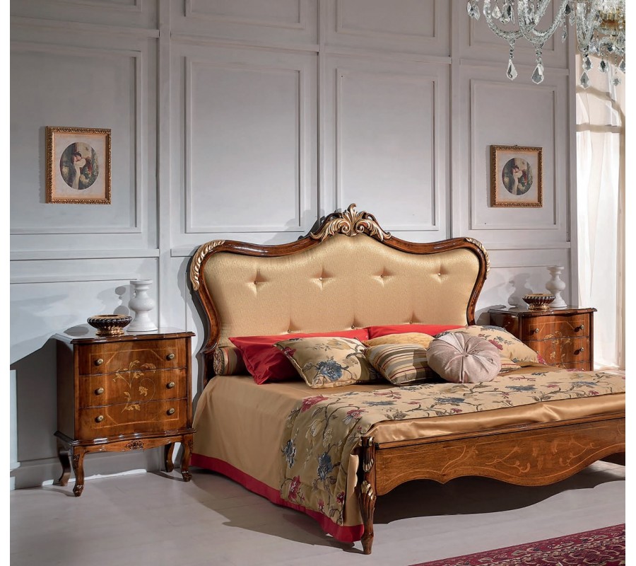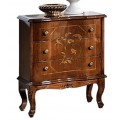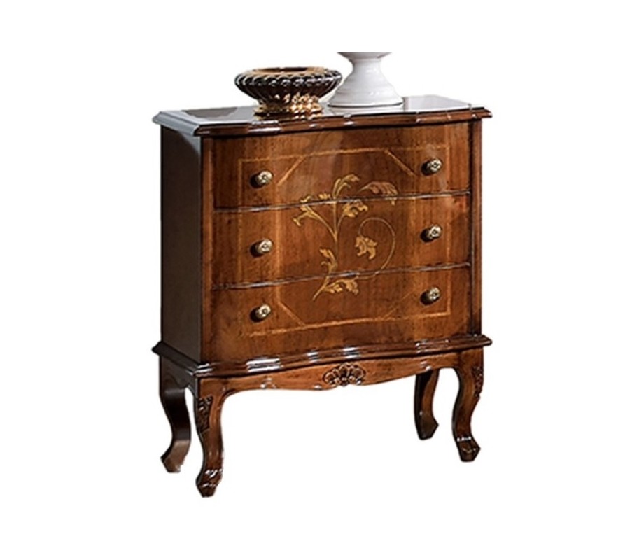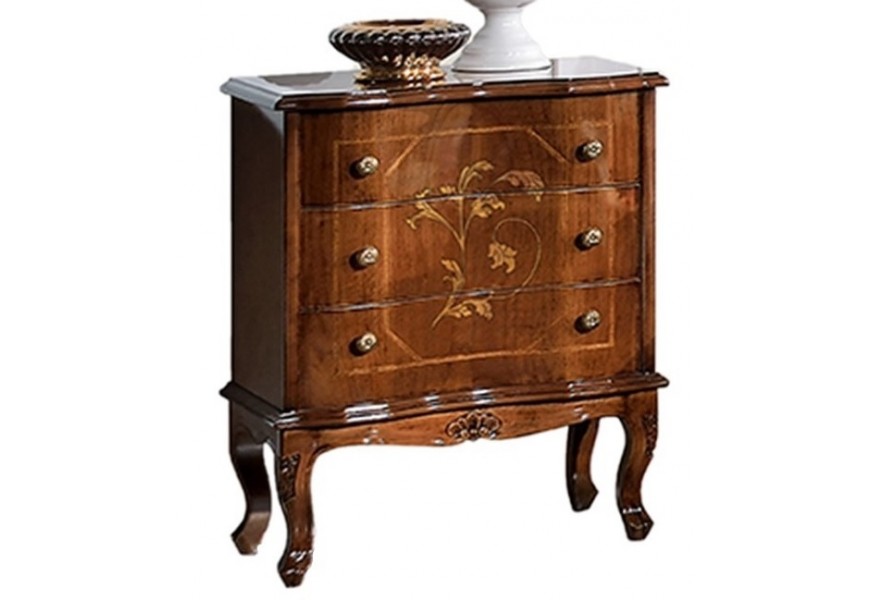 Nočný stolík z kolekcie masívneho talianskeho nábytku Clásica je vkusným kúskom, s ktorým si môžete doplniť klasický vzhľad vašej spálne s nádychom zámockého štýlu. Stolík je postavený na masívnych zaoblených nožičkách v štýle Chippendale, a taktiež sú nožičky obohatené o ručne vyhotovené vyrezávanie, vďaka ktorému sa zjemní výrazný masív. Masívne drevené spracovanie nočného stolíka je doplnené svetlou intarziou na troch zaoblených zásuvkách v rastlinnom vzore, čo dopĺňa klasický a historický vzhľad stolíka v kombinácií s kovovými rukoväťami. Vďaka spomenutým trom zásuvkám stolík ponúkne dostatok úložného priestoru pre vaše cennosti, a taktiež vďaka vrchnej doske s vyrezávaním po obvode budete mať priestor pre vaše obľúbené dekorácie. Klasické drevené prevedenie stolíka sa výborne kombinuje s posteľami v barokovom alebo zámockom štýle v klasicky ladených spálňach.