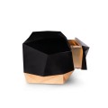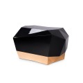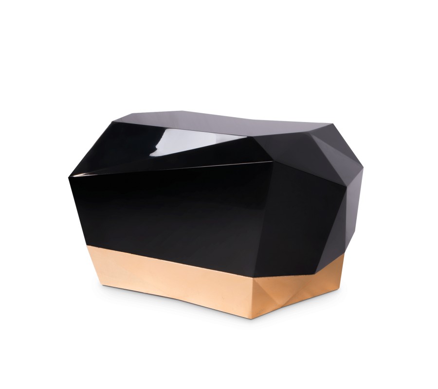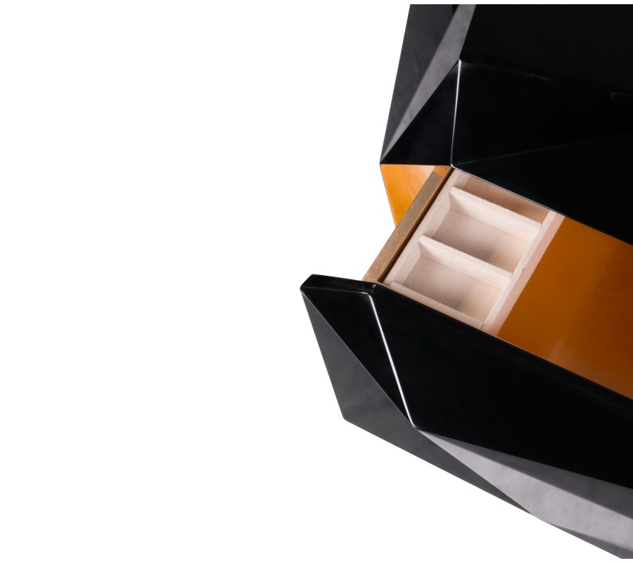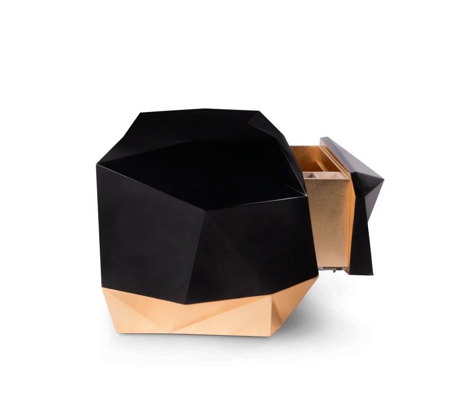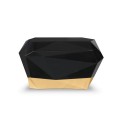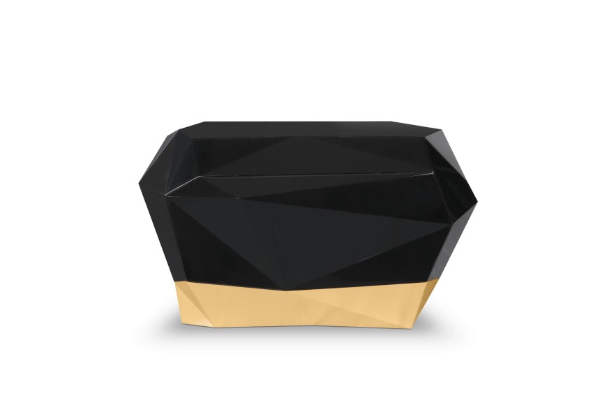 Luxusný dizajnový nočný stolík kolekcie Diamond dodá každej spálni jedinečnosť a originalitu. Masívny art-deco nočný stolík vyrobený z masívneho dreva pripomína drahokam svojimi nepravidelnými hranami. Čierna lakovaná základňa moderného nočného stolíka je povrchovo upravená kvalitným lakom, ktorý nočnému stolíku dodáva neopakovateľný lesk, je zasadená do masívnej pozlátenej základne. Kombinácia zlatej a čiernej farby dáva vyniknúť neopakovateľnému dizajnu a pozdvihuje jeho luxusný dizajn. Výnimočný art-deco nočný stolík disponuje jednou zásuvkou rozdelenou do dvoch častí, čo umožňuje prehľadné uloženie Vašich vecí. Interiér zásuvky, podobne ako základňa exkluzívneho nočného stolíka, je zdobená plátkovým vzhľadom, čo odráža skutočnú precíznosť a dôraz na každý detail. Moderný luxusný nočný stolík Diamond vnesie skutočnú osobnosť do každej spálne, pričom mäkko doplní hlavne tmavšie ladenie farieb a dekorácii v zlatej farbe. Stolík odporúčame kombinovať najmä s ostatným moderným, art-deco nábytkom našej ponuky,