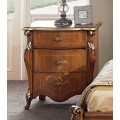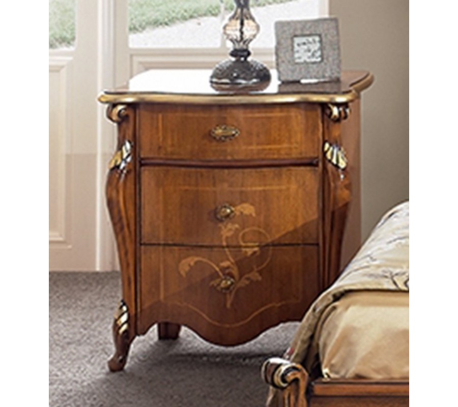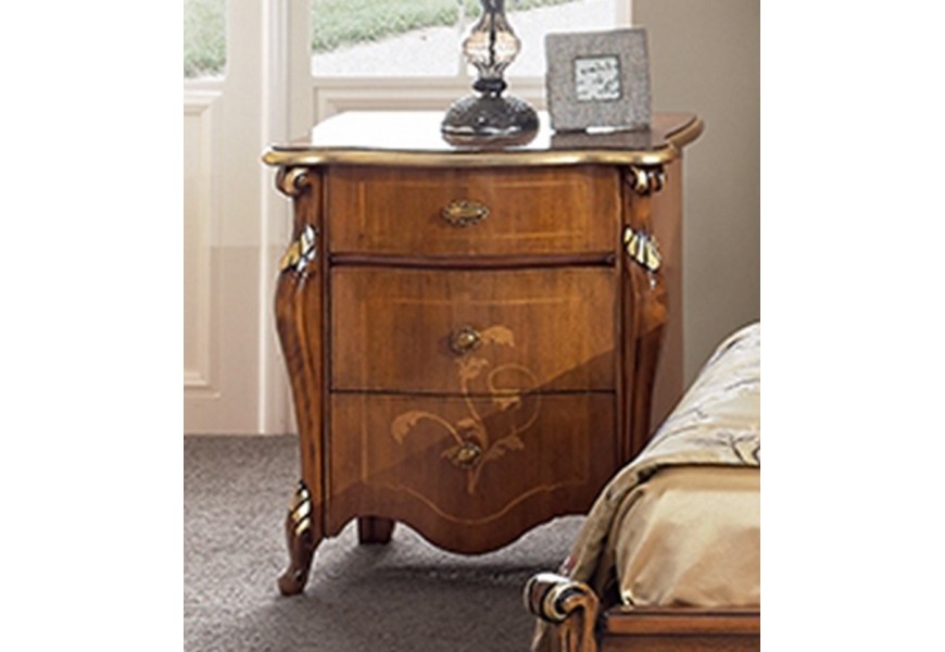 Štýlový nočný stolík z našej kolekcie Pasiones je kúskom vhodným predovšetkým do klasicky a rustikálne ladených interiérov. Zaujme svojím elegantným prevedením z masívneho dreva a jemnými zaoblenými líniami, ktoré dopĺňa precízne ručné vyrezávanie a vkusné ornamentálne zdobenie. Stolík disponuje tromi praktickými zásuvkami s kovovými rukoväťami. Prednú stranu zdobí jemná intarzia s florálnymi motívmi. Na výber ponúkame viacero možných farebných prevedení dreva aj kovových úchytov, vďaka čomu máte možnosť vytvoriť si skutočne jedinečný a originálny kúsok vhodný do vášho interiéru. Celkový rustikálny dizajn je doplnený vyrezávanými oblými nožičkami typickými pre štýl chippendale. Nočný stolík Pasiones vynikne najmä v kombinácii s ďalšími kúskami z masívneho dreva a čalúnenou posteľou či sedačkou.
