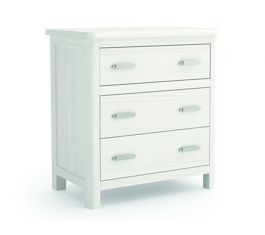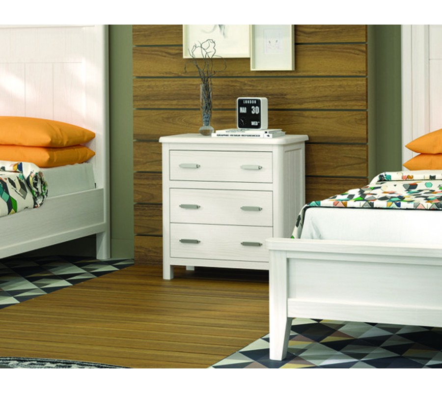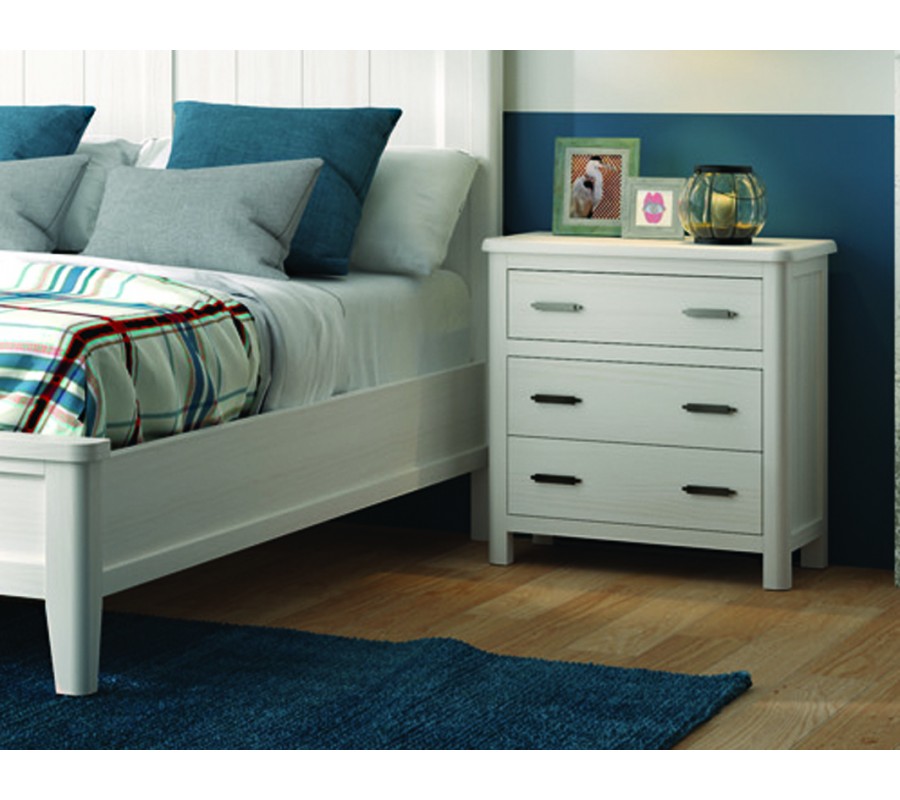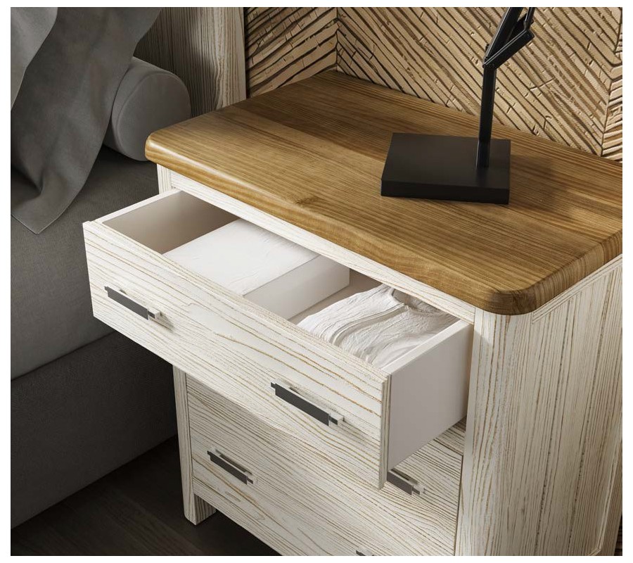 Nočný stolík má širokú obdĺžnikovú vrchnú dosku, na ktorú sa zmestí aj väčšia nočná lampa, knihy či ďalšie dôležité predmety, ktoré potrebujete mať na dosah. Uzatvárateľný úložný priestor pozostáva z troch nad sebou umiestnených zásuviek, z ktorých každá je vybavená dvomi úchytkami. Vrchná zásuvka je oddelená od spodných dvoch, čo vytvára zaujímavý dizajnový prvok. Predné rohy vrchnej dosky sú zaoblené a tento tvar prechádza aj cez fasádu stolíka, až po nízke nožičky. Moderná lineárna silueta tak pôsobí jemnejšie a elegantnejšie.