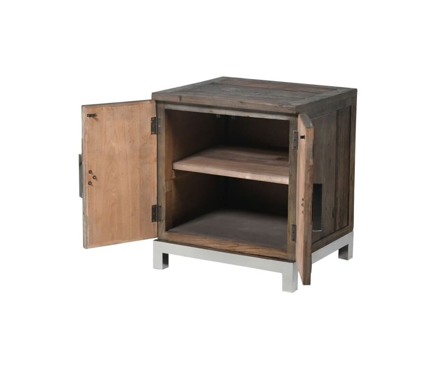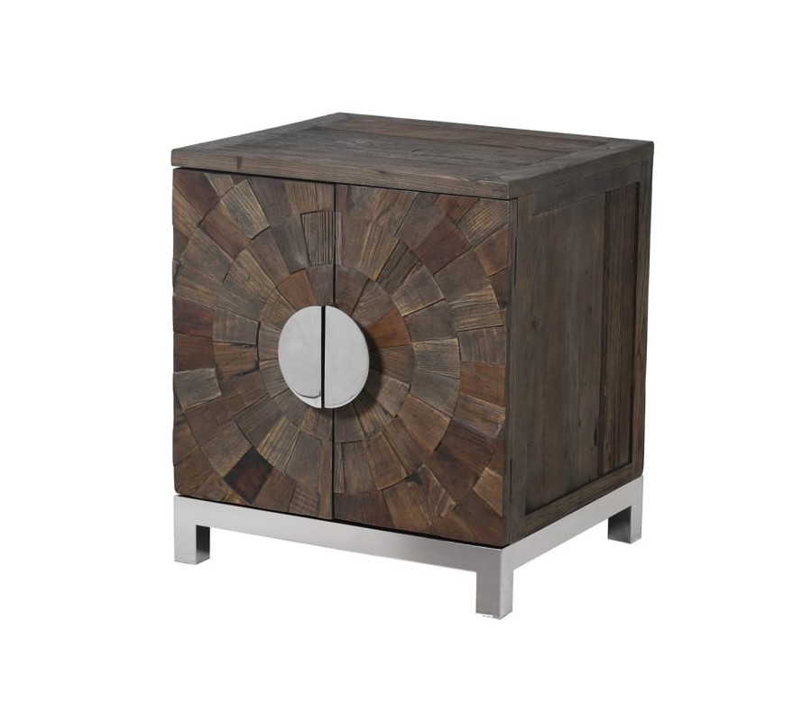 Dizajn nočného stolíka Furria zaujme všetkých, ktorí majú záľubu v originálnych kúskoch spájajúcich moderné prvky s nádychom luxusu a alternatívneho štýlu. Je vyrobený z recyklovaného brestového masívu a nesie sa v prírodnej tmavohnedej farbe. Povrchovú úpravu stolíka zdobí nádherná kresba dreva, vďaka ktorej tento kúsok do vášho priestoru vnesie nezameniteľný prírodný nádych. Disponuje dvomi praktickými poličkami, ktoré chráni dvojica dvierok. Práve dizajn dvierok robí stolík jedinečným a to vďaka štruktúrovanému motívu vytvorenú ukladaním malých kúskov drevených plátov do tvaru kruhu. Vzniknutý dizajn aj vďaka jemným farebným a štruktúrovým odchýlkam dostáva naturálny ráz, zároveň však pôsobí elegantne a hravo. Masívne telo stolíka dopĺňajú svetlosivé kovové úchyty na dvierkach a jednodché nožičky. Dizajnový nočný stolík Furria si svoje miesto nájde v luxusných moderných spálňach, kde príjemne doplní masívnu alebo koženú čalúnenú posteľ.