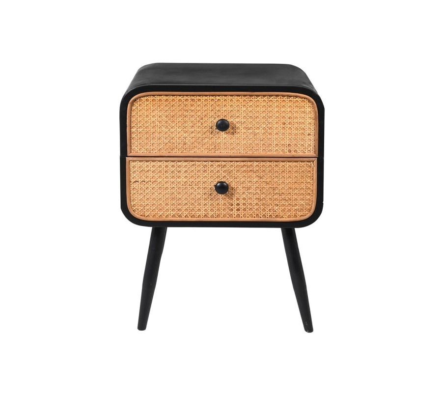 Dizajnový ratanový nočný stolík Omahu s čiernou kovovou konštrukciou a dvomi zásuvkami 60cm