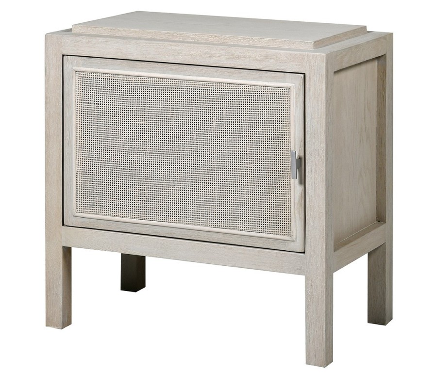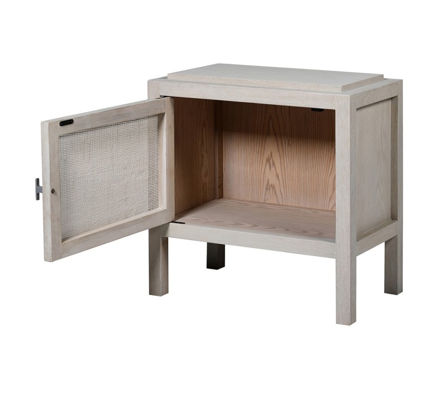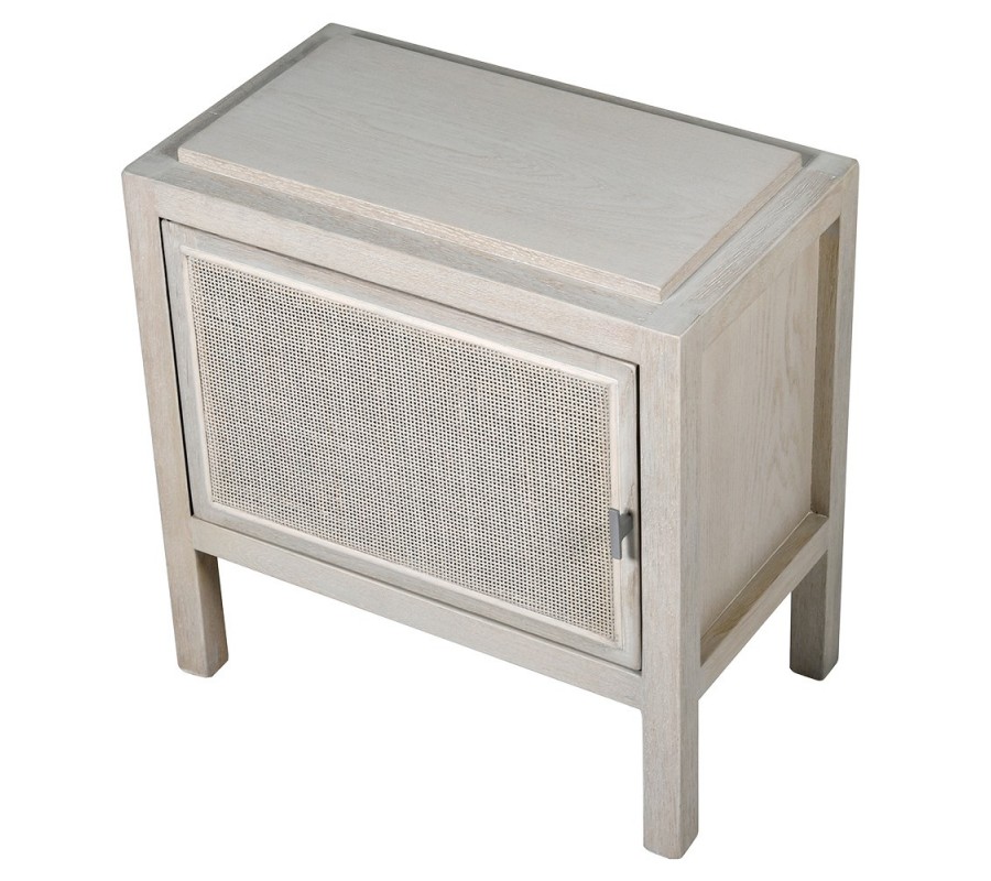 Luxusný pravostranný masívny nočný stolík Sazerto z dubového masívu v off white bielom vyhotovení s ratanovými dvierkami 62cm