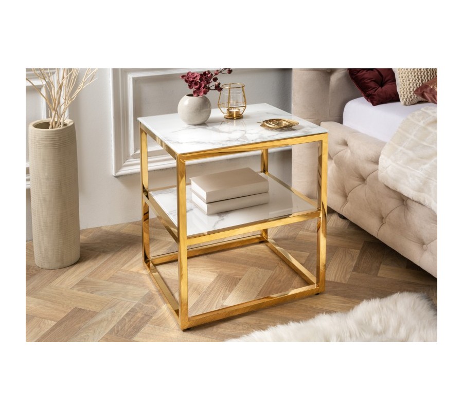 Moderný nočný stolík Gold Marbleux z bezpečnostného skla s bielym mramorovým vzhľadom s kovovou podstavou zlatá 50cm