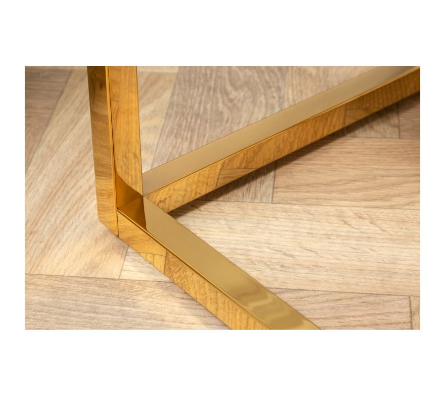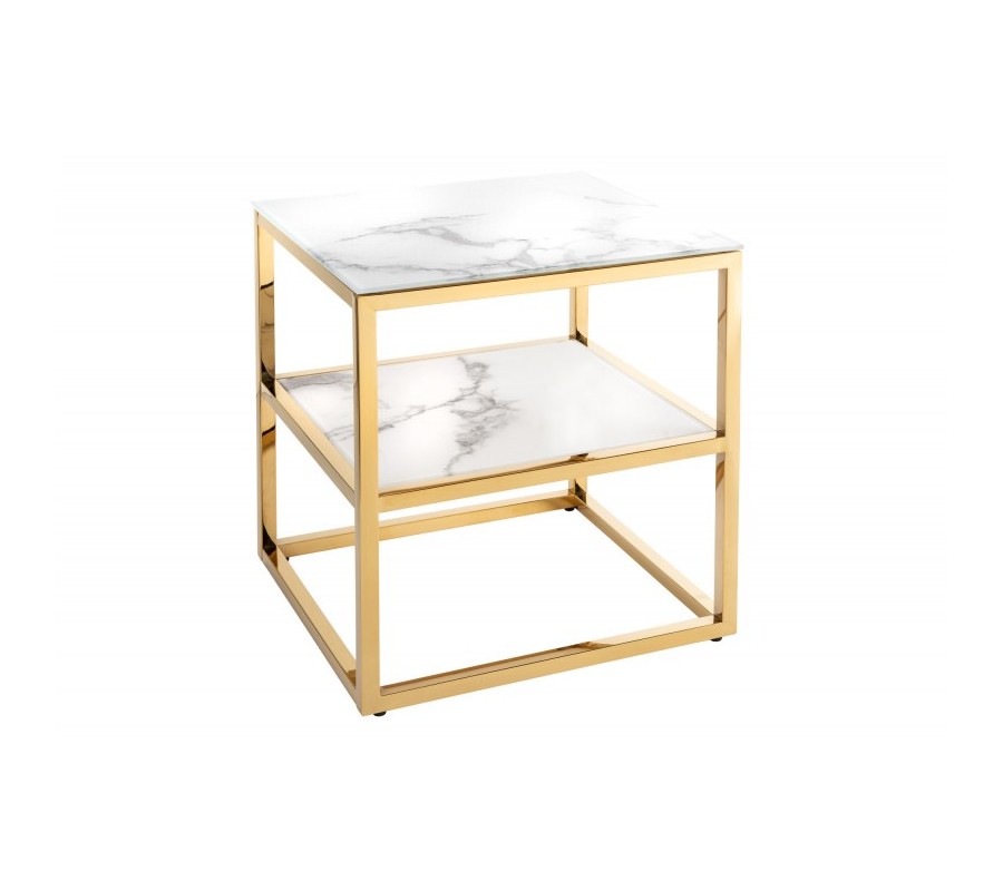 Nočný stolík z kolekcie nábytku v modernom prevedení Gold Marbleux Vás očarí svojím luxusným vzhľadom, kombinujúcim mramorový dizajn so zlatou farbou. Moderný nočný stolík Gold Marbleux disponuje kovovou konštrukciou v lesklej zlatej farbe, ktorá krásne dopĺňa biely mramorový vzhľad dosiek stolíka. Kovová podstava nočného stolíka Gold Marbleux drží dve dosky z bezpečnostného skla, ktoré disponuje moderným vzhľadom v bielom mramorovom prevedení. Maximálna nosnosť 6 milimetrov hrubej vrchnej a strednej dosky je 50 kilogramov. Vďaka svojmu modernému vyhotoveniu môžete využiť stolík Gold Marbleux ako nočný stolík v moderných spálňach, alebo v obývačke ako luxusný príručný stolík ku Vášmu kreslu v kombinácií s bielym moderným nábytkom a zlatými kovovými prvkami.