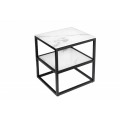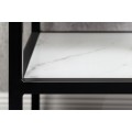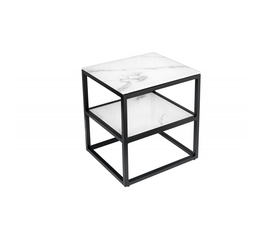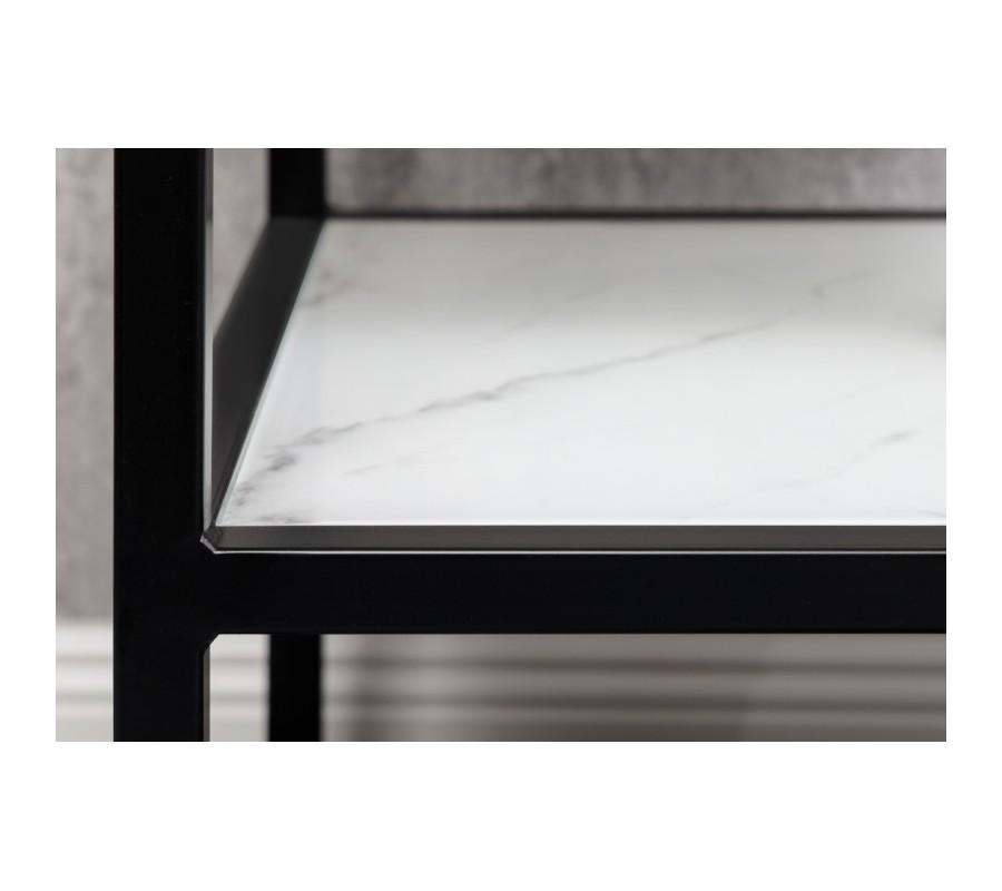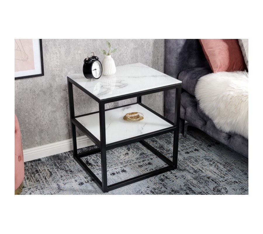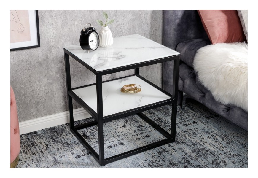 Industriálny nočný stolík Industria Marbleux z bezpečnostného skla s bielym mramorovým vzhľadom s čiernou kovovou podstavou 45cm