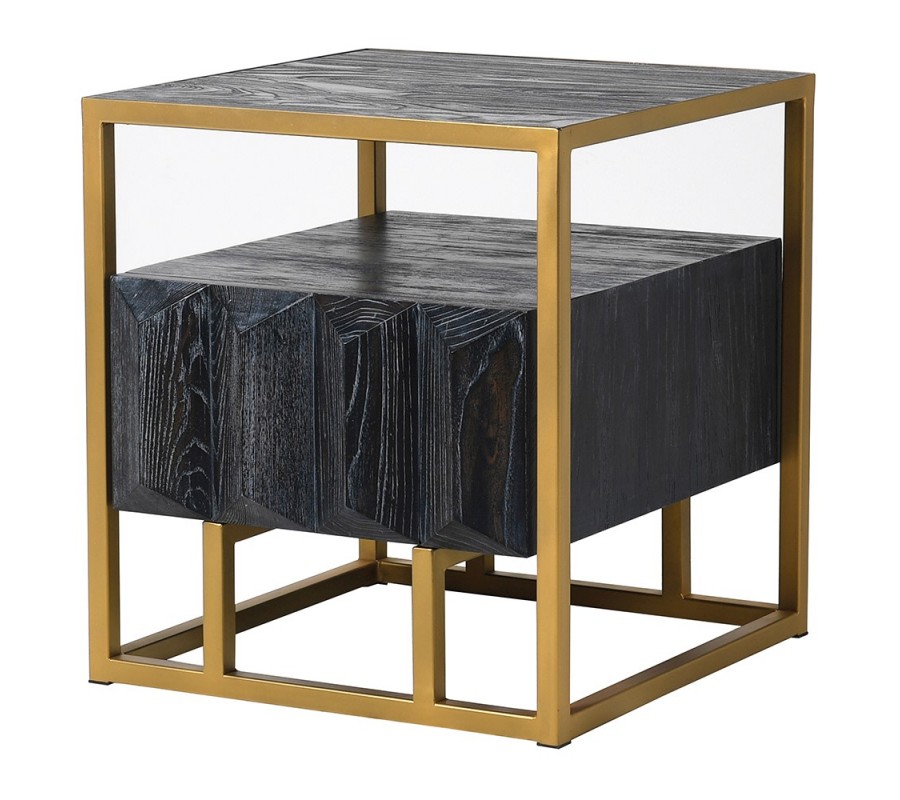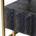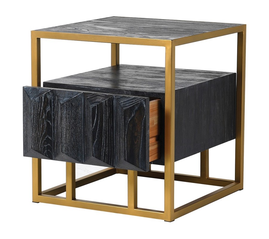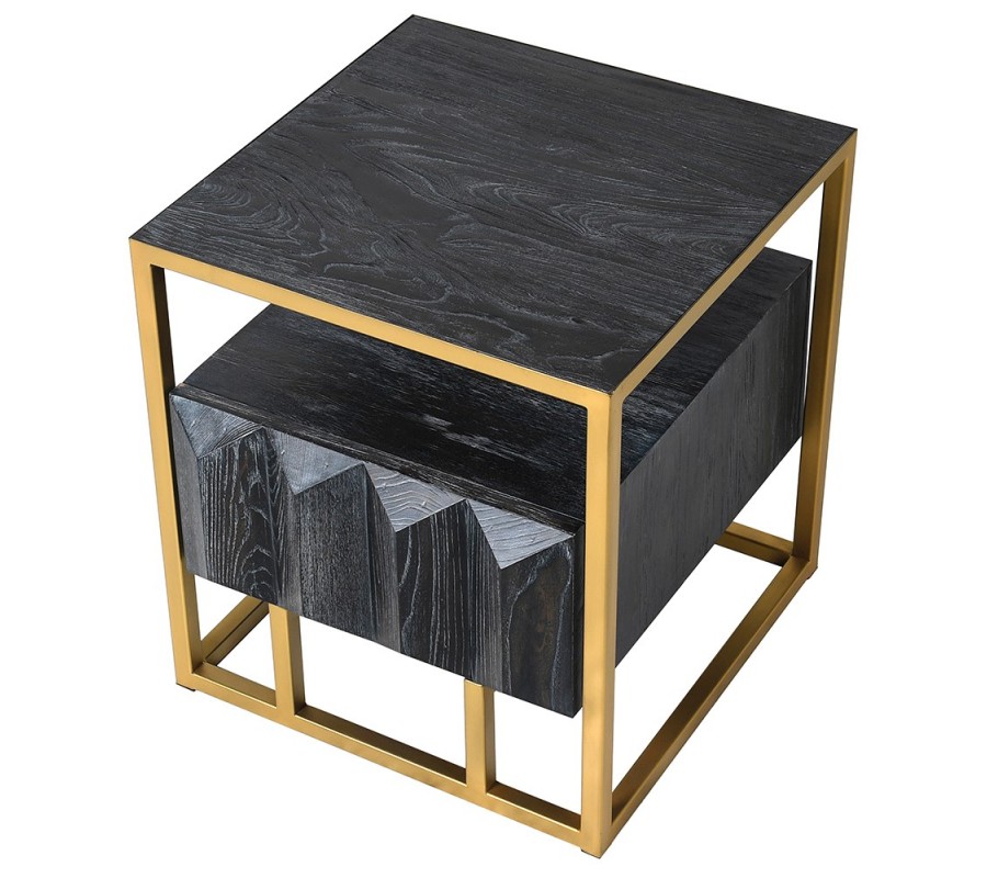 Príručný stolík Loop v art-deco štýle Vás zaujme svojím nadčasovým vzdušným vyšperkovaným dizajnom, ktorý prinesie luxusný vzhľad do Vášho interiéru. Art deco stolík Loop je vyrobený z lakovaného masívneho brestového dreva v čiernej farbe, ktoré je obohatené o štýlové vyrezávanie s 3d reliéfnym tvarom na prednej strane praktickej zásuvky, ktorý v kombinácií so svetlom vytvára jedinečný dizajnový efekt. Vrchnú dosku a stredovú časť so zásuvkou chráni železný rám s konštrukciou v zlatej farbe, ktorá v kombinácií so spomenutým vyrezávaním a čiernou farbou vytvorí nezameniteľný art-deco vzhľad. Vďaka svojmu vyhotoveniu dokáže nočný stolík Loop osviežiť dizajn či už vašej modernej spálne, alebo obývačky, kde sa stane centrom pozornosti, alebo môže perfektne doplniť art-deco interiér s podobným čiernym masívnym nábytkom so zlatými doplnkami.