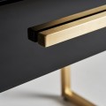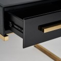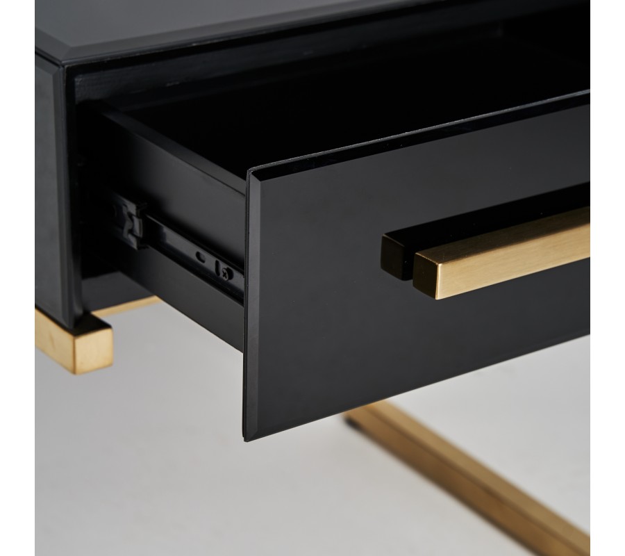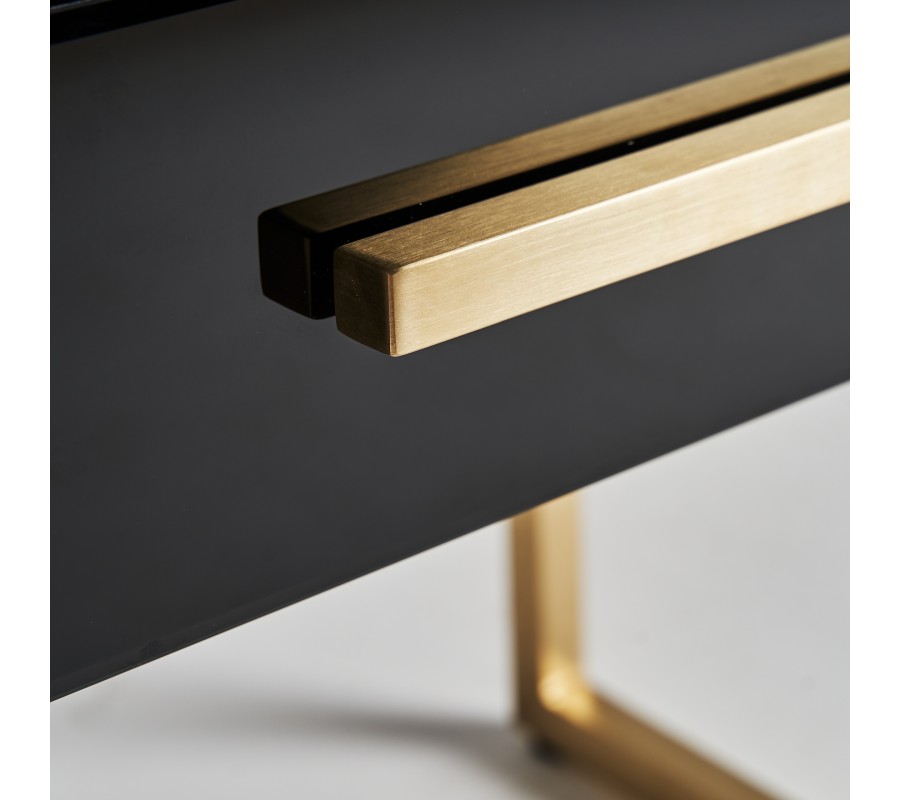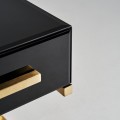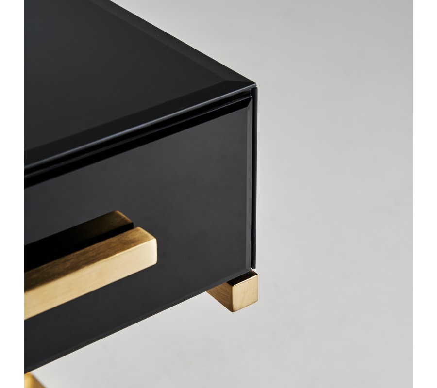 Luxusný nočný stolík Flara prináša eleganciu a extravagantný vzhľad v obľúbenom art-deco štýle. Nočný stolík Flara sa pýši jednoduchými, priamymi líniami a zaujímavou farebou kombináciou čiernej a zlatej farby, ktorá prináša prosperitu, extravaganciu a taktiež aj silu a rázny nádych. Luxusný stolík Flara je vyrobený zo skla v matnej čiernej farbe. Doska stolíka disponuje rozmernou a praktickou zásuvkou s oceľovou rukoväťou, ktorá farebne doplní oceľovú podstavu s dvomi spojenými nožičkami v tvare písmena L. Jedinečný vzhľad luxusného nočného stolíka Flara v modernom štýle odporúčame kombinovať s čiernym nábytkom so zlatými doplnkami, a taktiež napríklad s postelami so žltým alebo krémovým čalúnením zadného čela a so sivými závesmi.