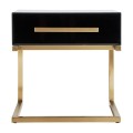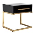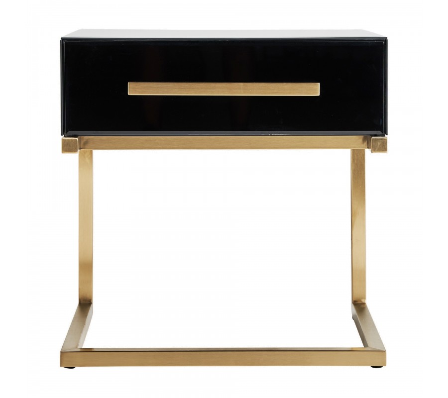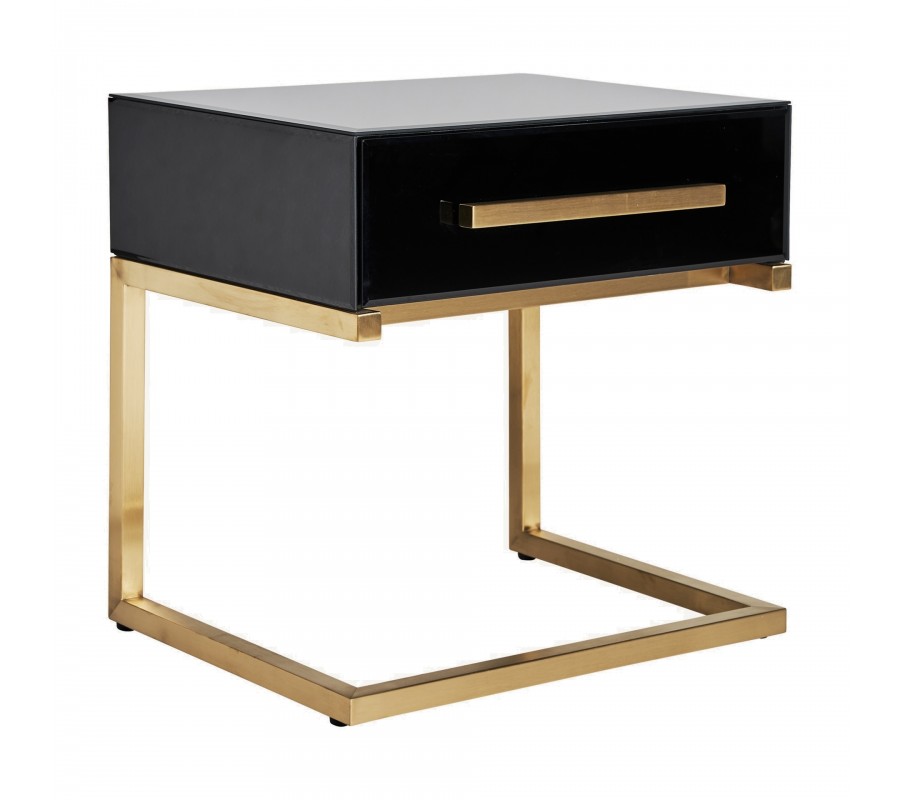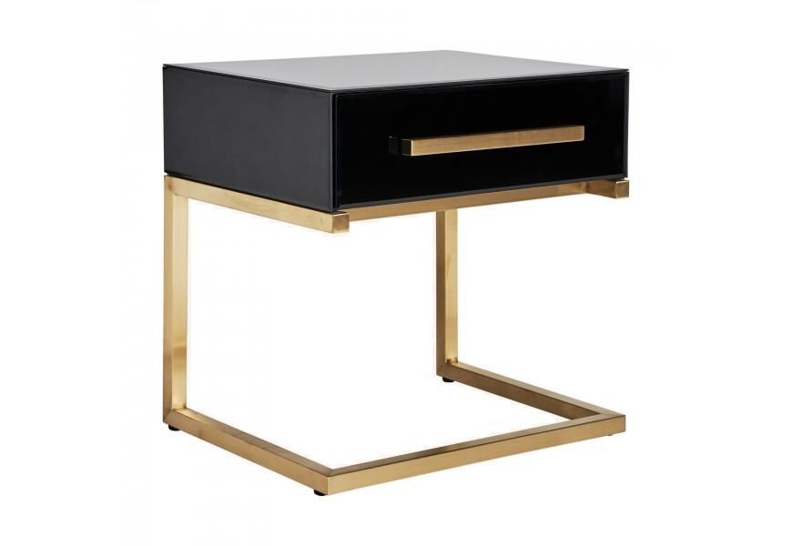 Moderný čierny nočný stolík Flara v sklenenom art-deco vyhotovení so zásuvkou a kovovými nožičkami v zlatej farbe 51cm