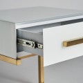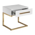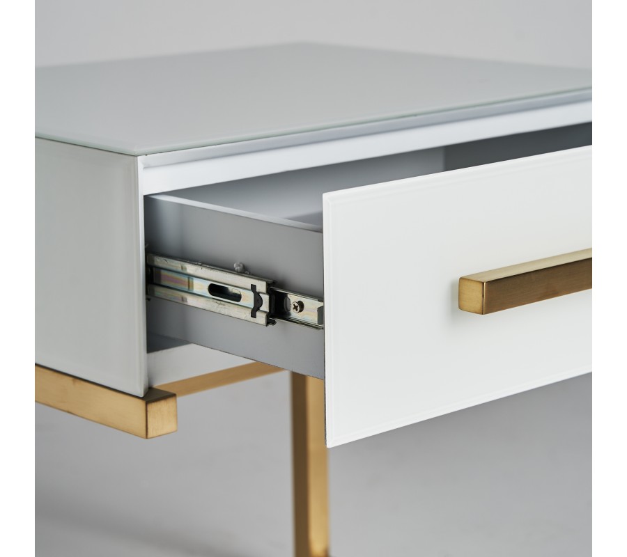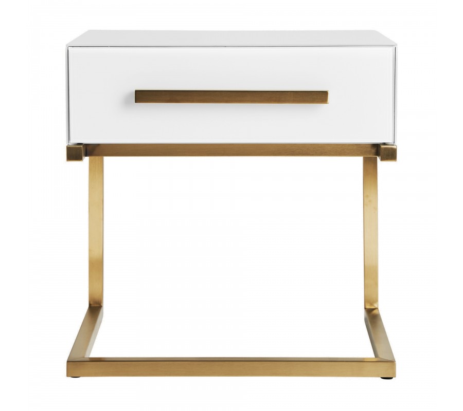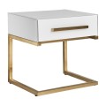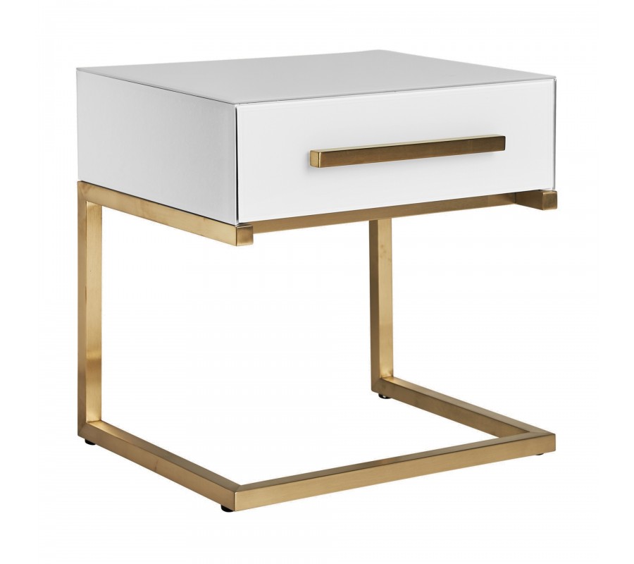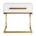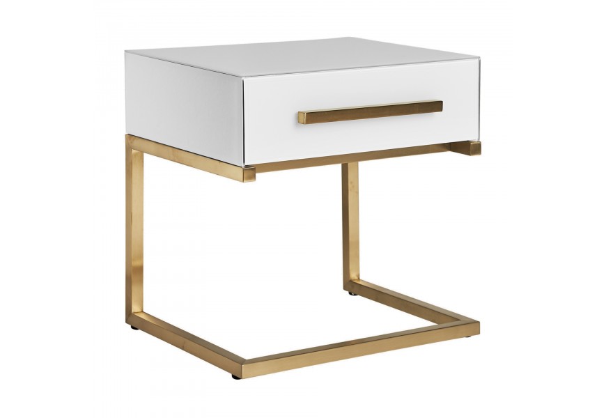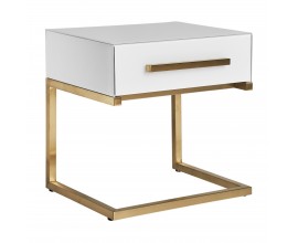 Art-deco biely nočný stolík Flara v matnom sklenenom prevedení so zásuvkou a kovovými nožičkami v zlatej farbe 51cm