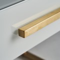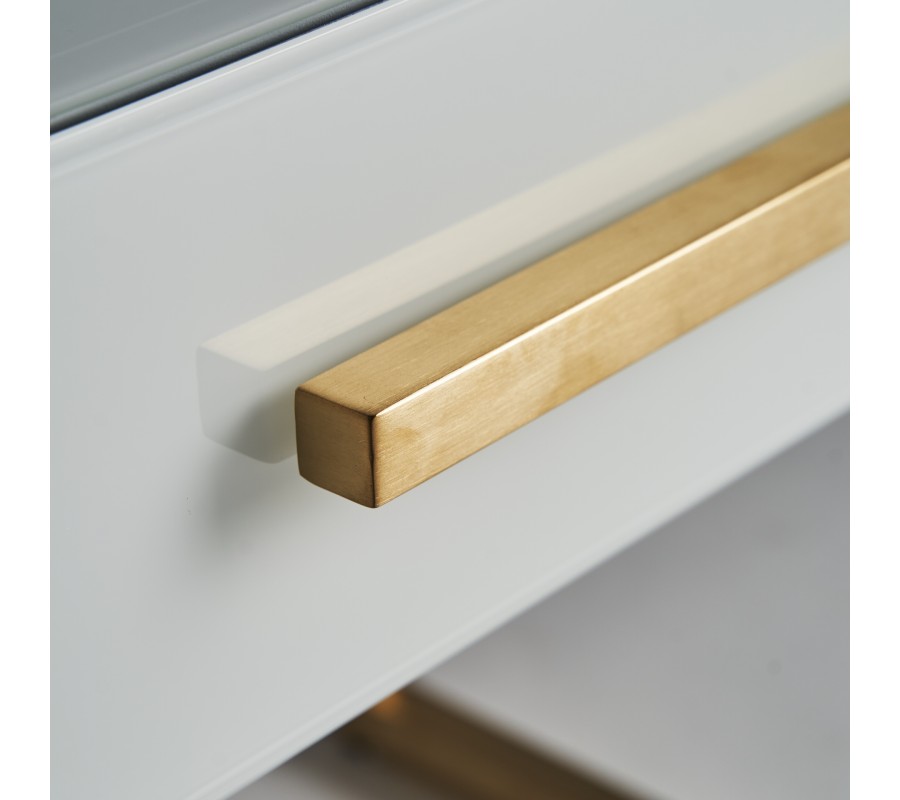 Minimalistický, no zároveň luxusný vzhľad. Toto sú slová, ktoré perfektne vystihujú dizajnovú stránku art-deco štýlového nočného stolíka Flara. Nočný stolík disponuje vyhotovením zo skla v matnej bielej farbe, ktoré je doplnené žiarivou zlatou farbou. Zlatá farba rozžiari oceľovú rukoväť na praktickej zásuvke, a taktiež aj oceľovú podstavu s dvomi spojenými nožičkami v tvare písmena L. Stolová doska stolíka Flara sa nesie v jednoduchom tvare kvádru, zasadeného do postavy v priamom uhle, čo spoločne tvorí symetriu ostrých uhlov a priamych línií, typických pre štýl art-deco. Kombinácia bielej a zlatej farby prinesie do Vašej spálne harmóniu a luxus, čo sa umocní kombináciou s krémovým čalúnením postelí a s bielym moderným nábytkom.