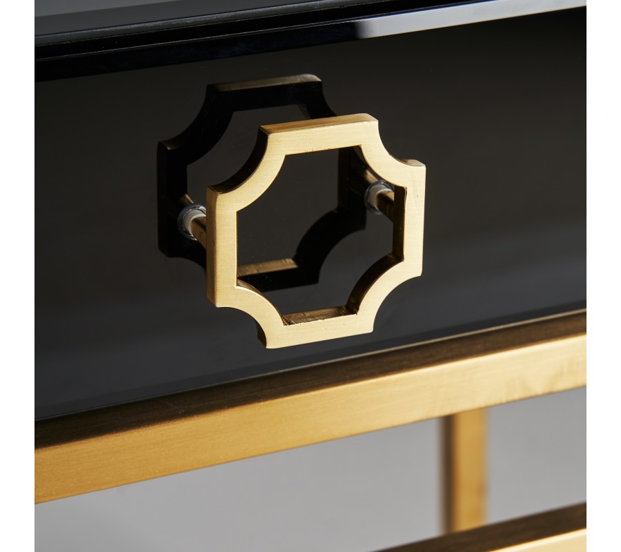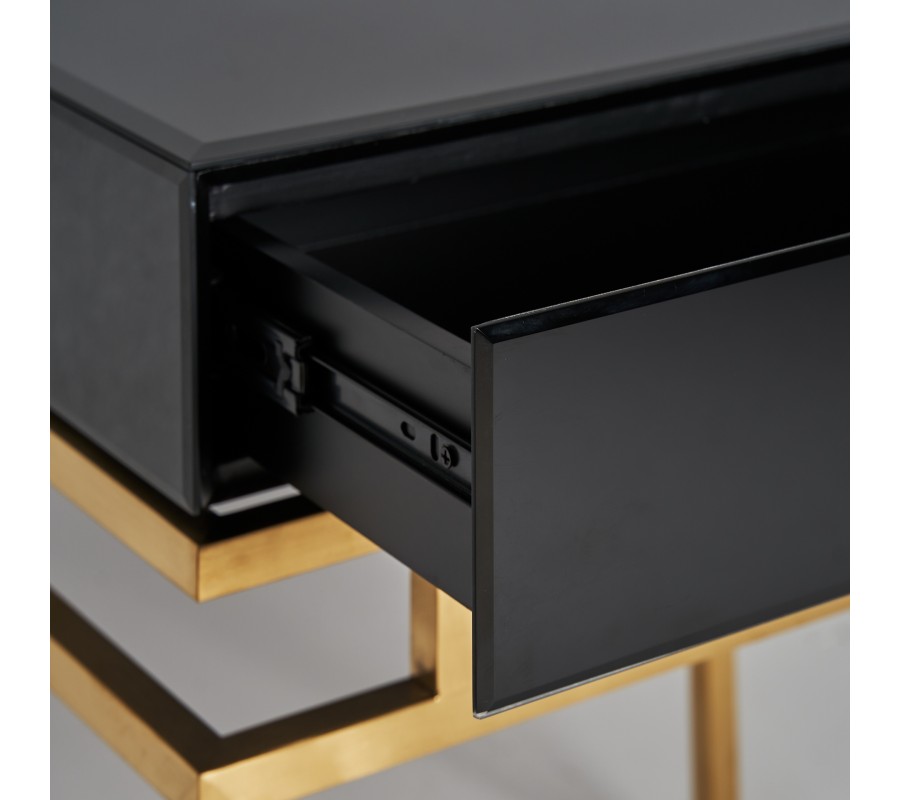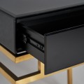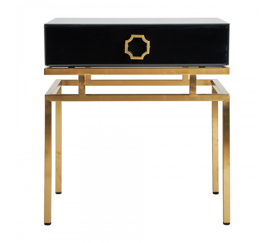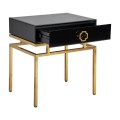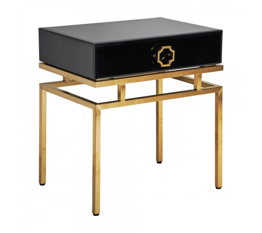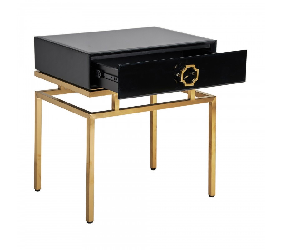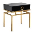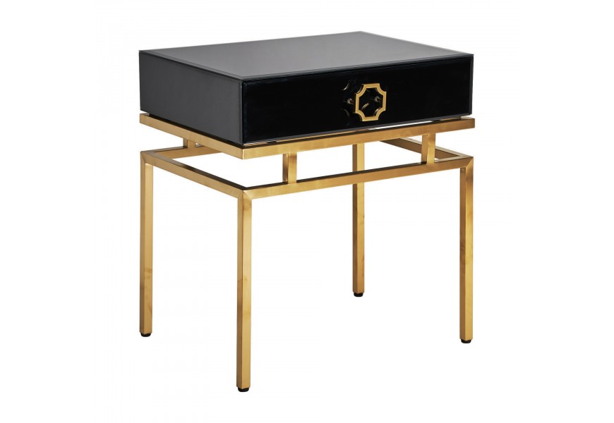 Art-deco čierny nočný stolík Gasol v luxusnom sklenenom vyhotovení so zásuvkou a kovovými nožičkami v zlatej farbe 60cm