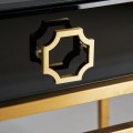 Luxusný nočný stolík Gasol je jedinečným nadčasovým kúskom v modernom štýle, ktorý Vás zaujme svojím skleneným prevedením s jednoduchými tvarmi, kombinujúcimi čiernu a zlatú farbu. Nočný stolík Gasol disponuje vrchnou doskou v spomenutom sklenenom čiernom vyhotovení, ktorému dominuje rozmerná zásuvka s dizajnovou tvarovanou rukoväťou v zlatej farbe. Zlaté kovové prevedenie rukoväte dopĺňa podstava so štyrmi priamymi nožičkami v oceľovom vyhotovení zlatej farby, čo podčiarkne vzhľad produktu v štýle art-deco. Kombinácia čiernej a zlatej farby vytvorí luxusný vzhľad, ktorý odporúčame doplniť čiernym nábytkom so zlatými doplnkami, a taktiež s postelami so žltým čalúnením zadného čela a so sivými závesmi.