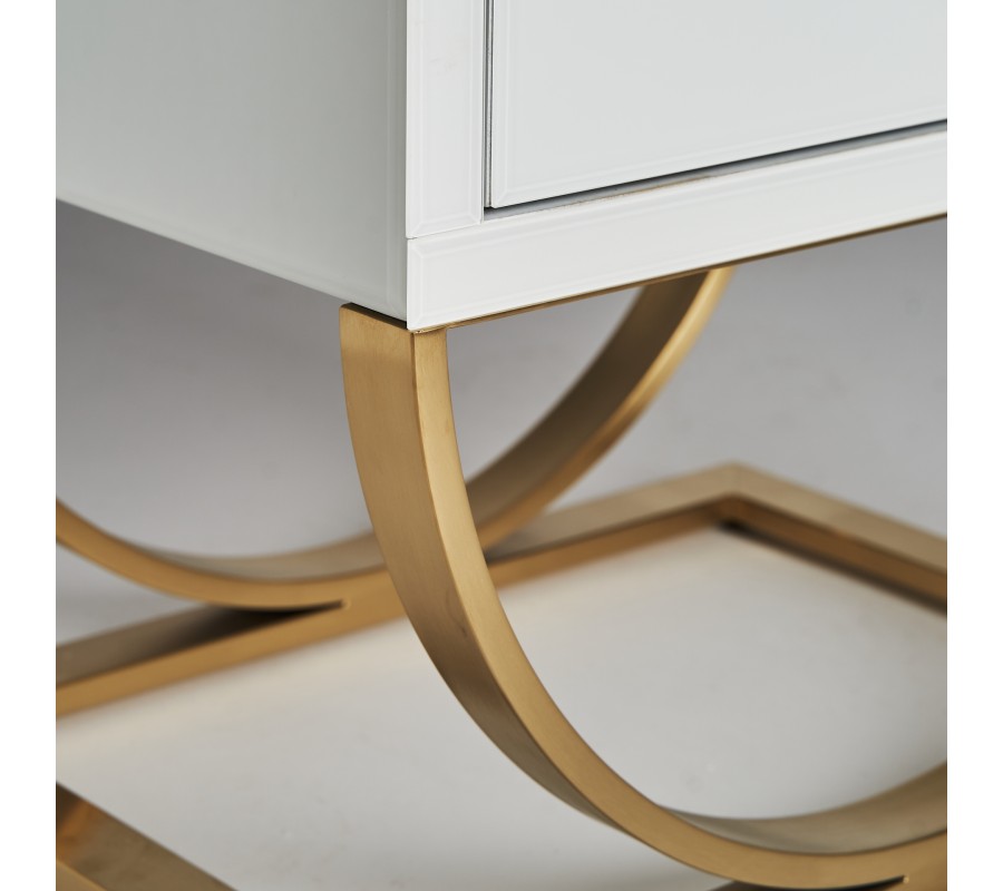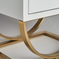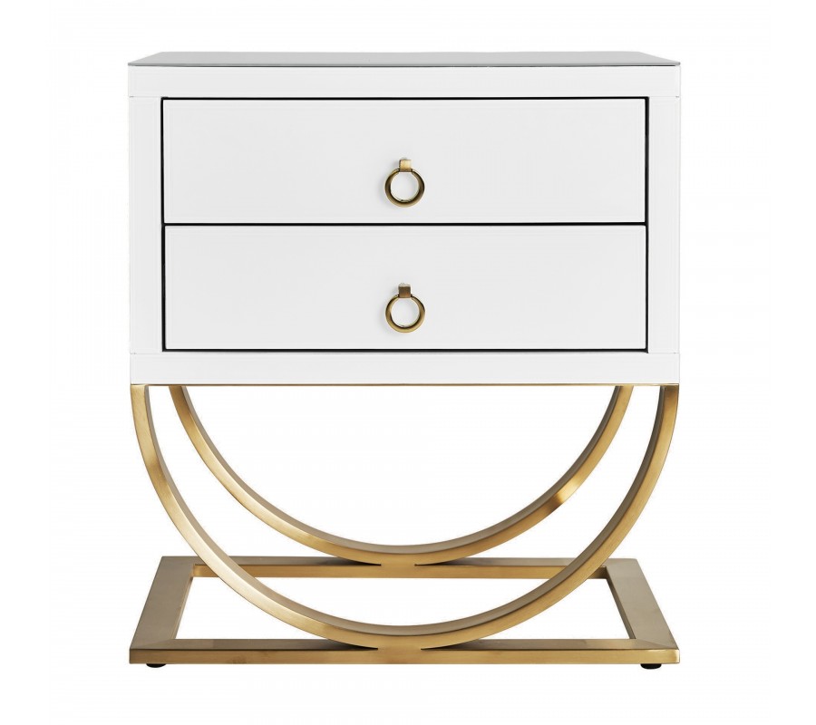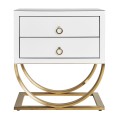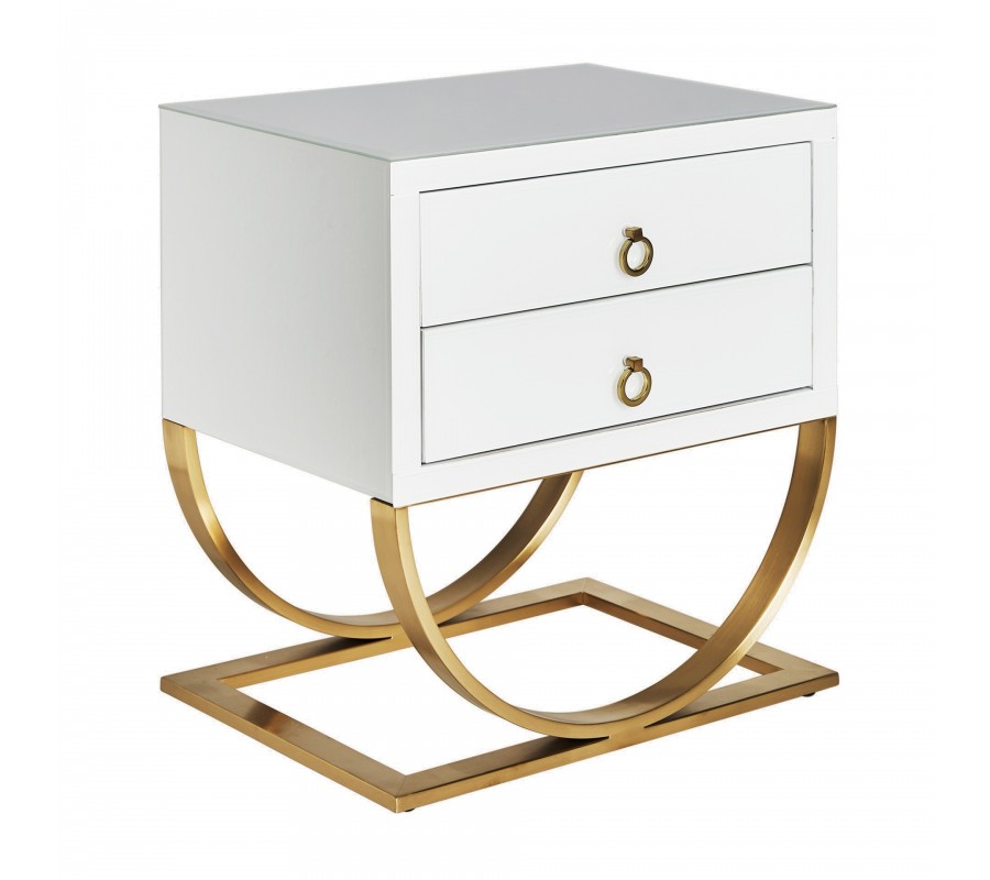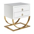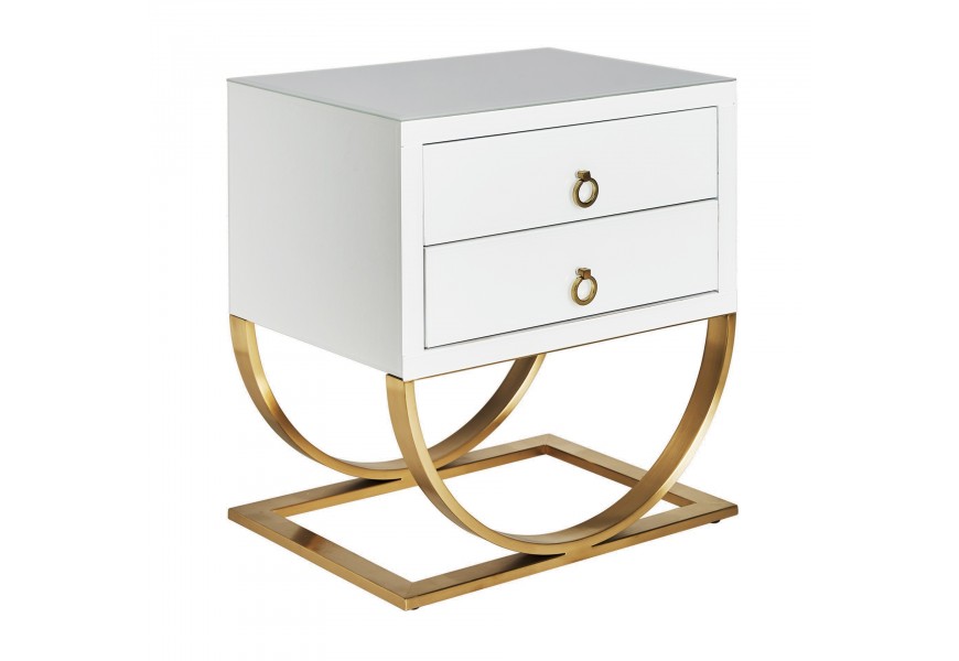 Moderný biely nočný stolík Bynum v sklenenom vyhotovení s dvoma zásuvkami a zaoblenou kovovou podstavou v zlatej farbe 60cm