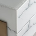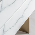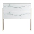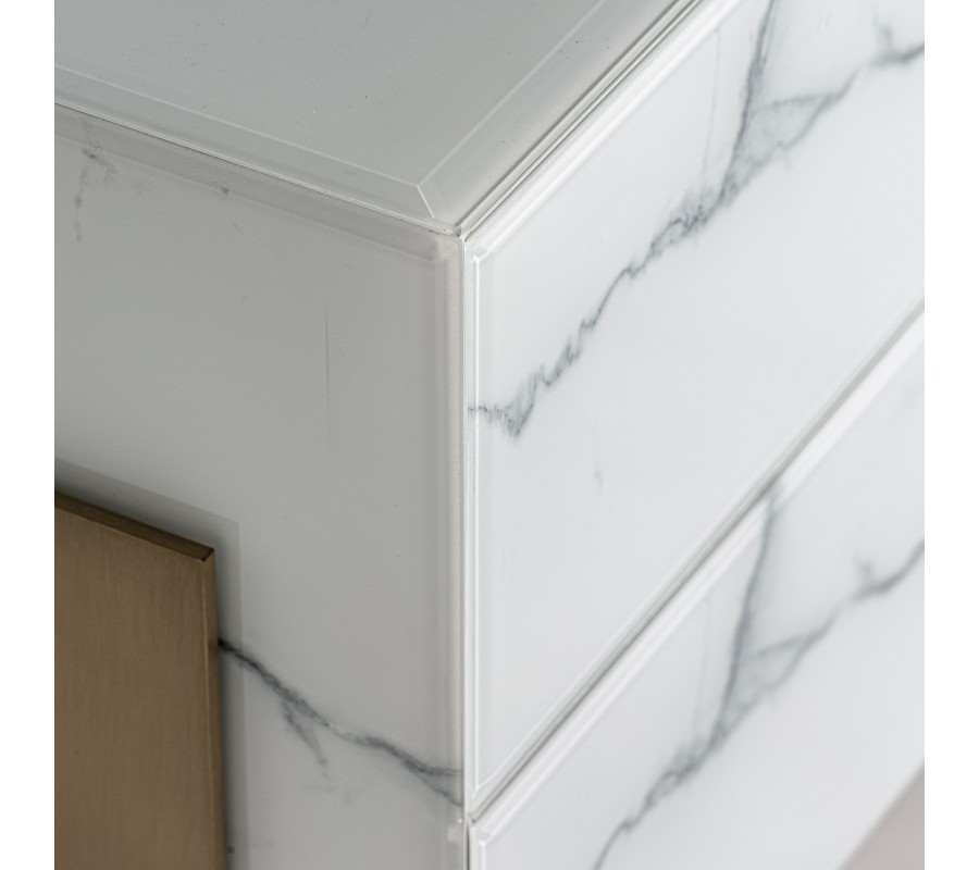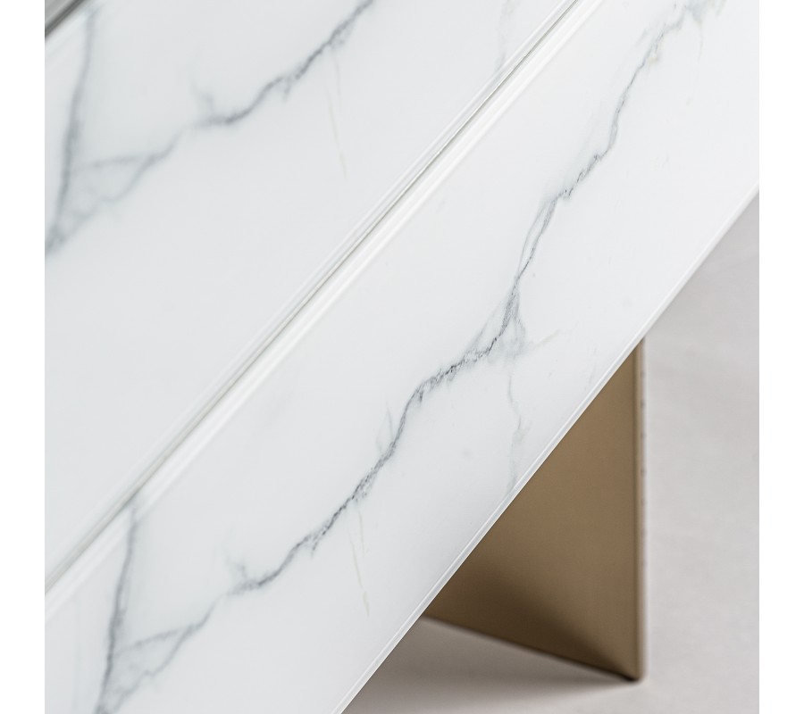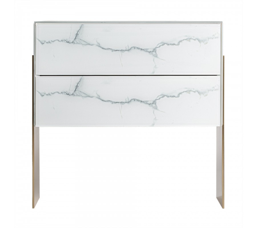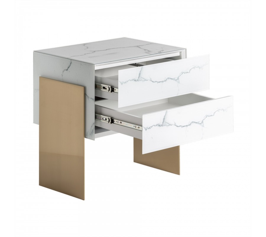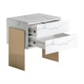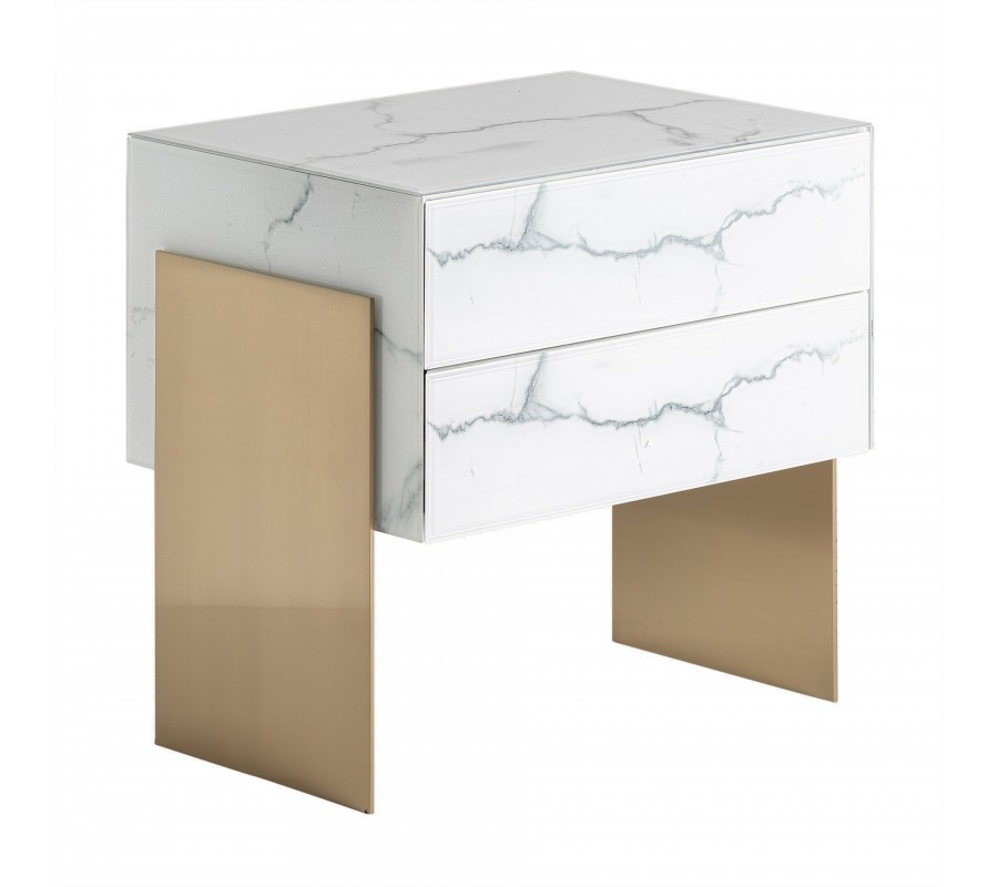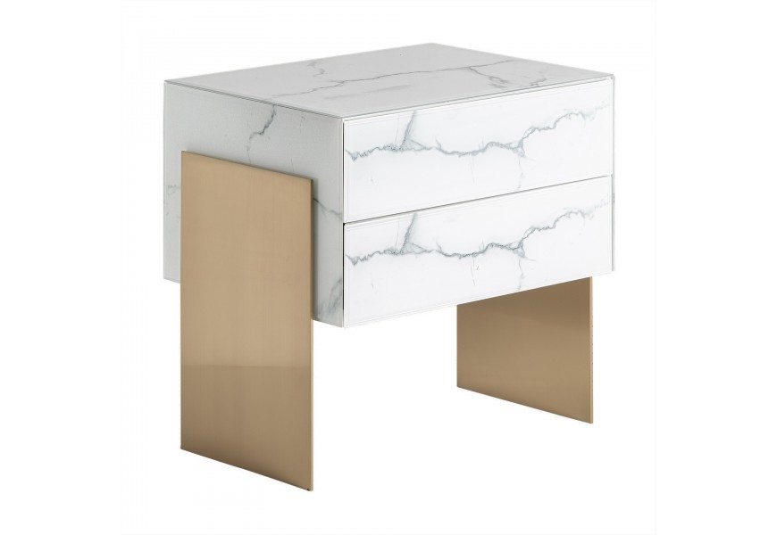 Nadčasový moderný nočný stolík Neva Marble je svojím dizajnovým prevedením lákadlom pre oči, ktoré prinesie jedinečný luxusný vzhľad priamo do Vašej spálne. Luxusný nočný stolík Neva Marble disponuje skleneným vyhotovením s mramorovým vzhľadom, ktoré je doplnené dvomi obdĺžnikovými doskami z oceľe v zlatej farbe, fungujúcimi ako nožičky, čo zaručí stabilitu produktu. Kombinácia mramorovécho povrchu a zlatých kovových nožičiek je jedným z najľahších spôsobov ako vytvoriť luxusný vzhľad, preto je vhodná kombinácia so zlatými lampami, bielym lesklým nábytkom, a s krémovo čalúnenými posteľami. Dizajn nočného stolíka Neva Marble dopĺňajú dve rozmerné zásuvky, ktoré Vám ponúkajú dostatok úložného priestoru pre odklad rôznych vecí.