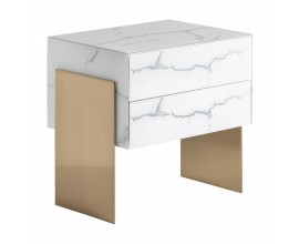 Exkluzívny biely nočný stolík Neva Marble v modernom mramorovom prevedení s dvoma zásuvkami a nožičkami v zlatej farbe 55cm