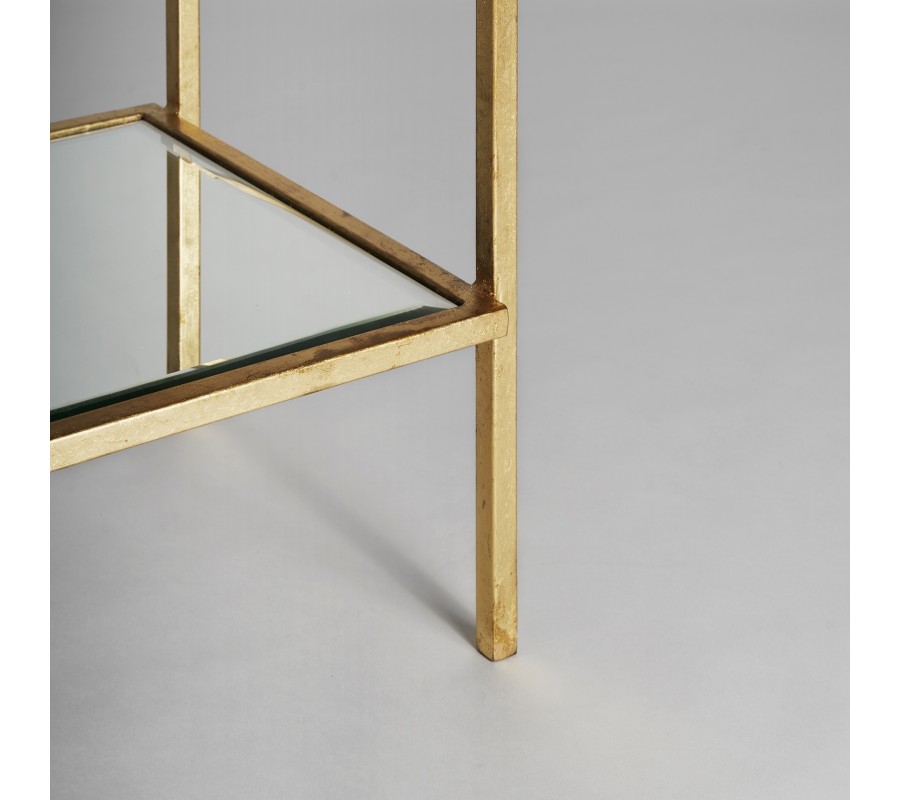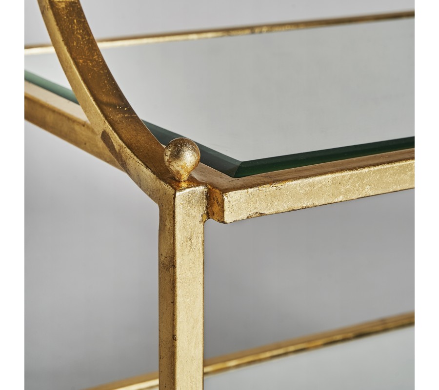 Stavte na štýl a vzdušný vzhľad luxusného nočného stolíka z kolekcie art-deco dizajnového nábytku Amuny. Glamour stolík Amuny Vám ponúka minimalistický, no zároveň luxusne pôsobiaci dizajn, ktorý kombinuje sklenené a zlaté prvky. V prvom rade Vás môže zaujať kvalitné vyhotovenie, ktorému dominuje otvorená železná konštrukcia v zlatej farbe, ktorá taktiež chráni sklenené, priestranné police. Minimalistický dizajn konštrukcie je obohatený dizajnovým dekorom na hranách vrchnej poličky, čo vytvorí živý, zaujímavý efekt so zaoblenými tvarmi konštrukcie. Luxusný nočný stolík Amuny vynikne svojím zlatým prevedením a krásne vynikne s bledo čalúnenými postelami, s lesklým bielym nábytkom a zlatými doplnkami.