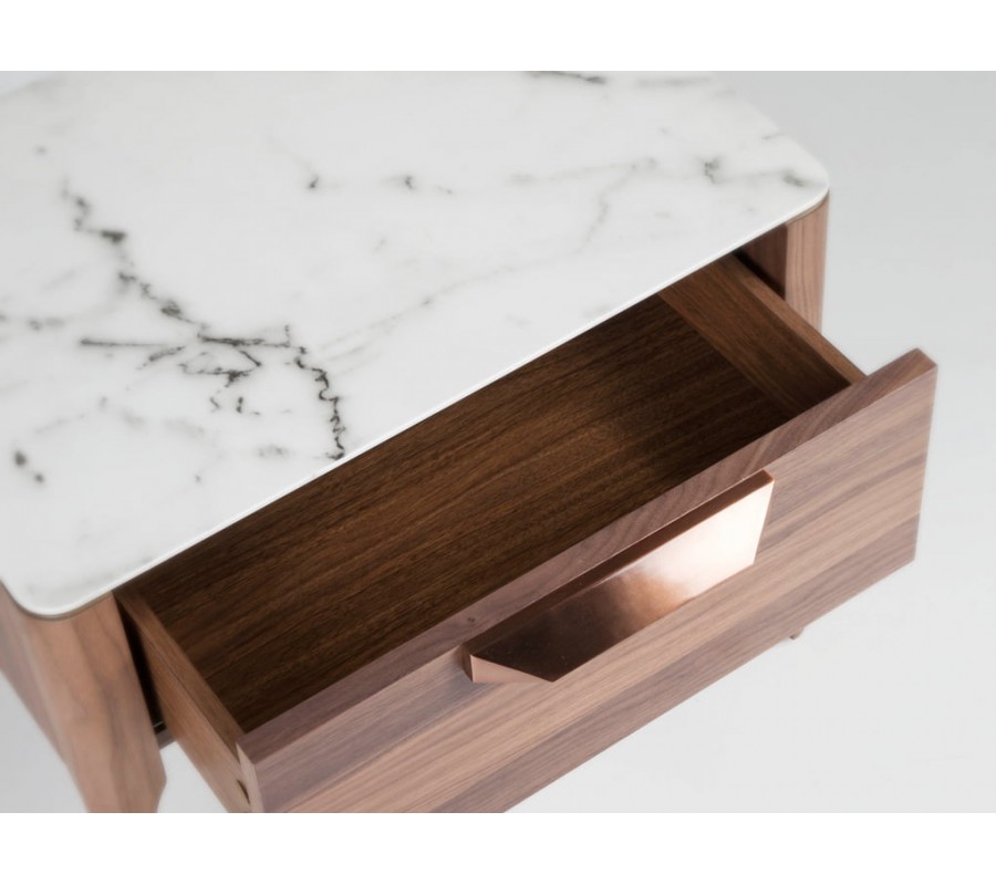 Jedinečný dizajn nočného stolíka Forma Moderna dopĺňa praktická zásuvka so „soft-close“ zatváraním. Pre uľahčenú manipuláciu Vám nočný stolík Forma Moderna ponúka oceľovú rukoväť v medenej farbe, ktorá krásne doplní inovatívny dizajn nočného stolíka.