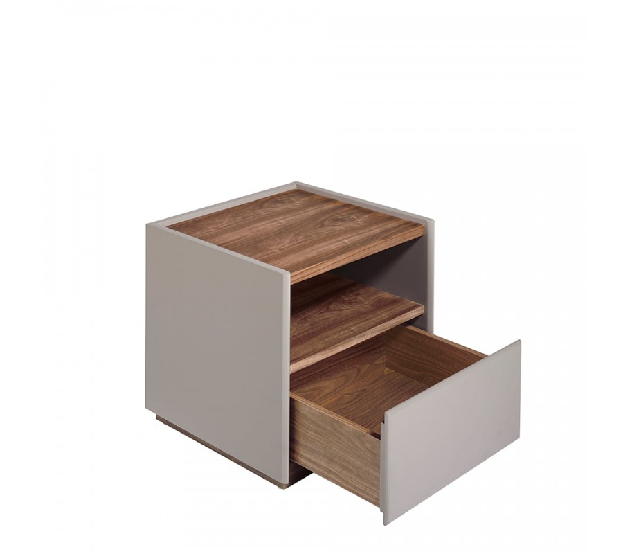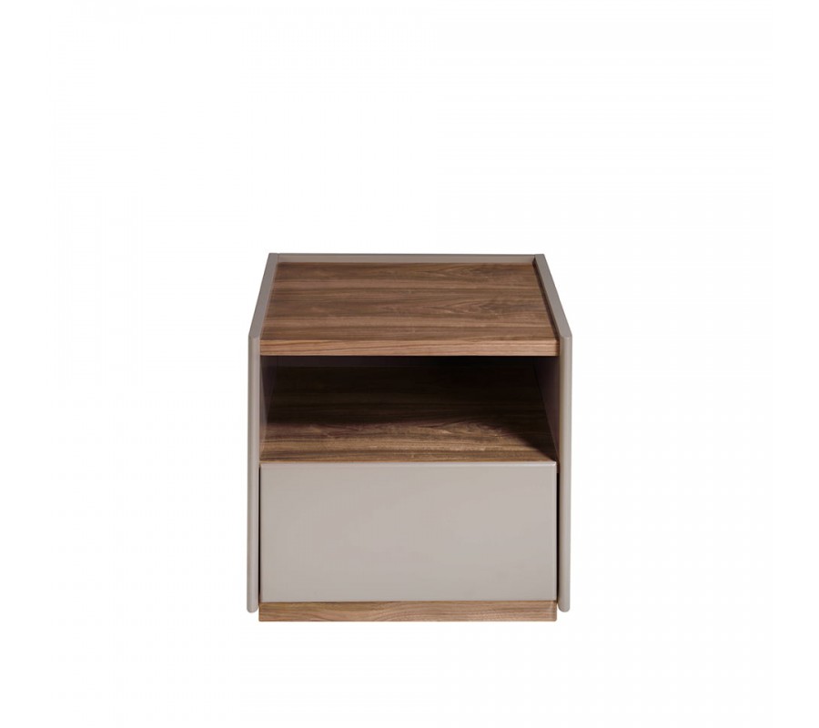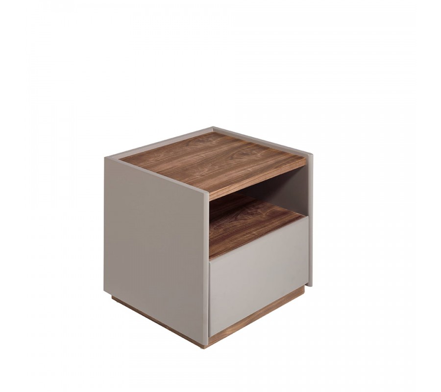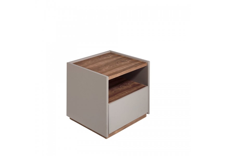 Nočný stolík Forma Moderna je vyrobený z dreva, obohateného o kvalitnú orechovú dyhu v hnedej farbe, ktorá prinesie prírodný nádych do Vášho interiéru, najmä v kombinácií so živou zeleňou. Dizajnová stránka je doplnená o lakovanie po stranách stolíka v univerzálnej sivej farbe.