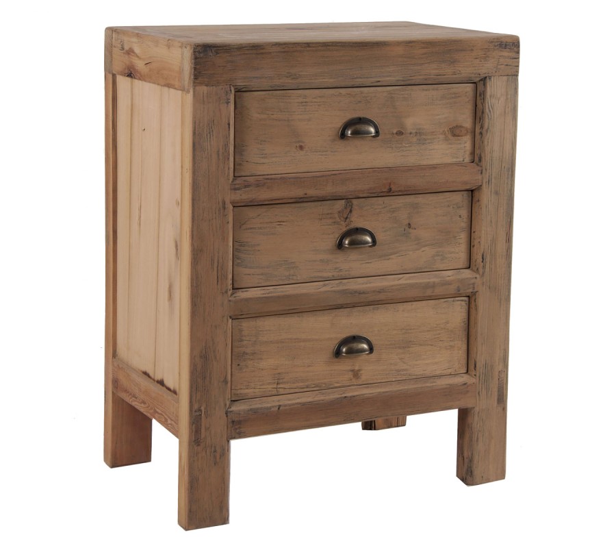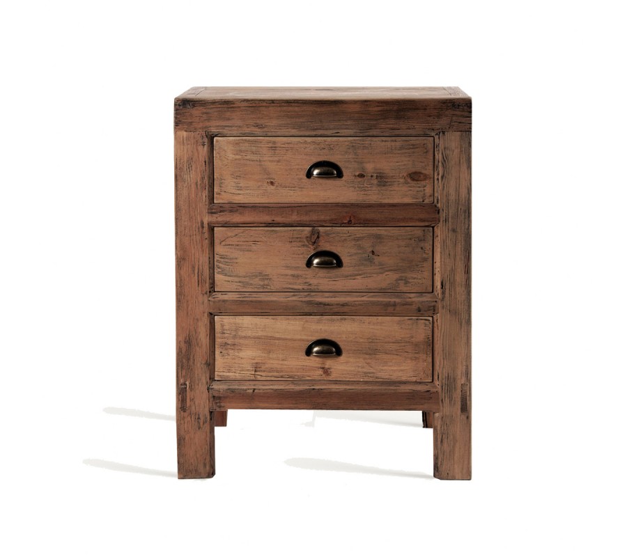 Vidiecky nočný stolík Drea v hnedom prevedení z masívneho brestového dreva s tromi zásuvkami 85cm